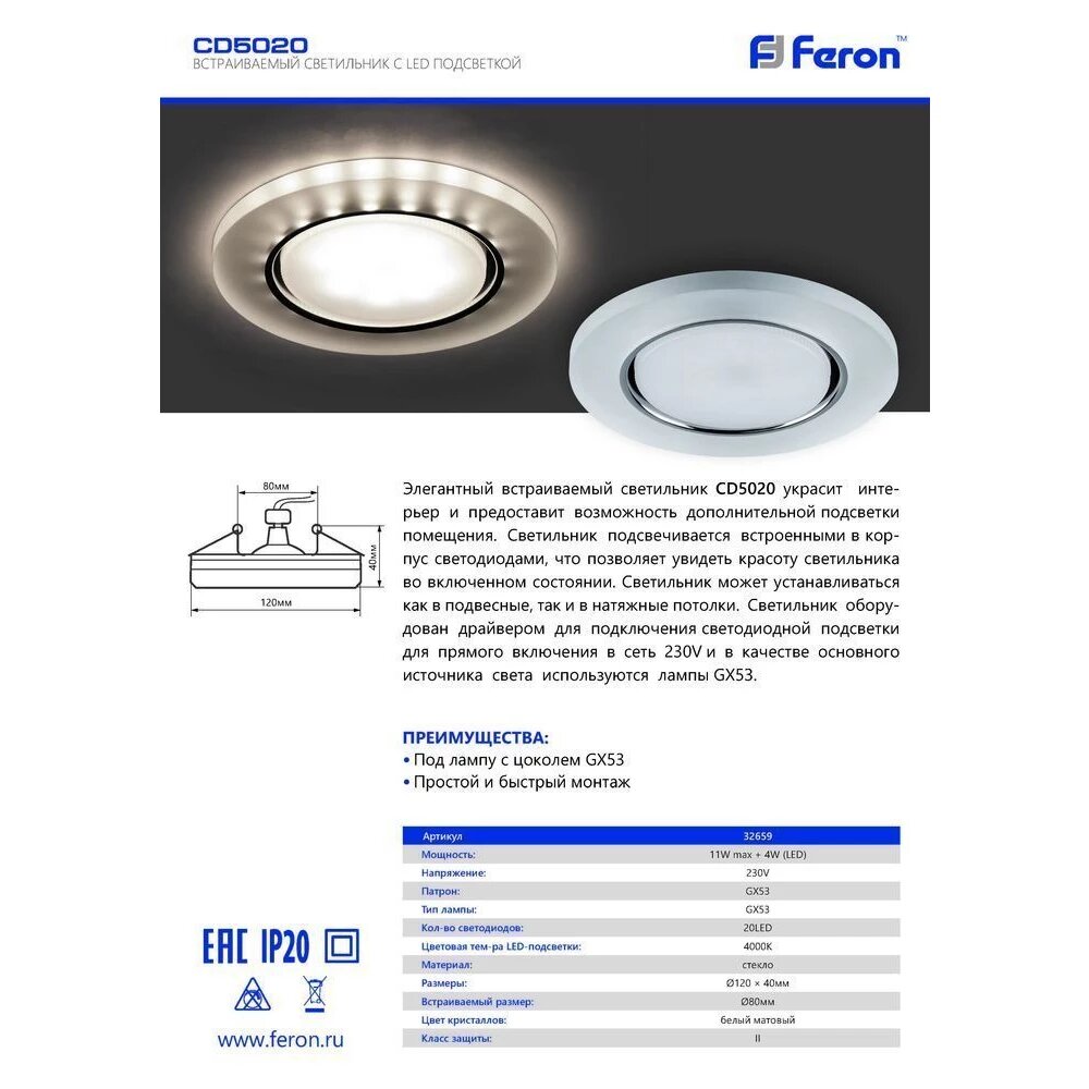 Сервис сравнения цен СкидкаГИД предлагает сравнить цены на товар «Встраиваемый светильник Feron 32659 CD5020»