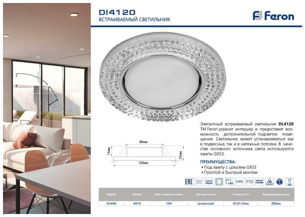 Сервис сравнения цен СкидкаГИД предлагает сравнить цены на товар «Встраиваемый светильник Feron 40516 DL4120»
