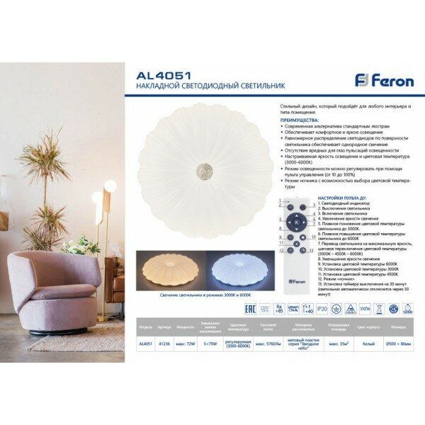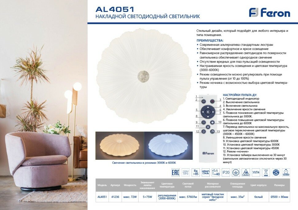 Светильник накладной светодиодный, потолочный управляемый (ДПО) FERON , 72W, 3000К-6000K (теплый-белый-дневной), 230V, 5760Lm, IP20, угол рассеивания 120°, цвет белый, корпус штампованная сталь, рассеиватель матовый пластик, серия "звездное небо", 500*500*80
