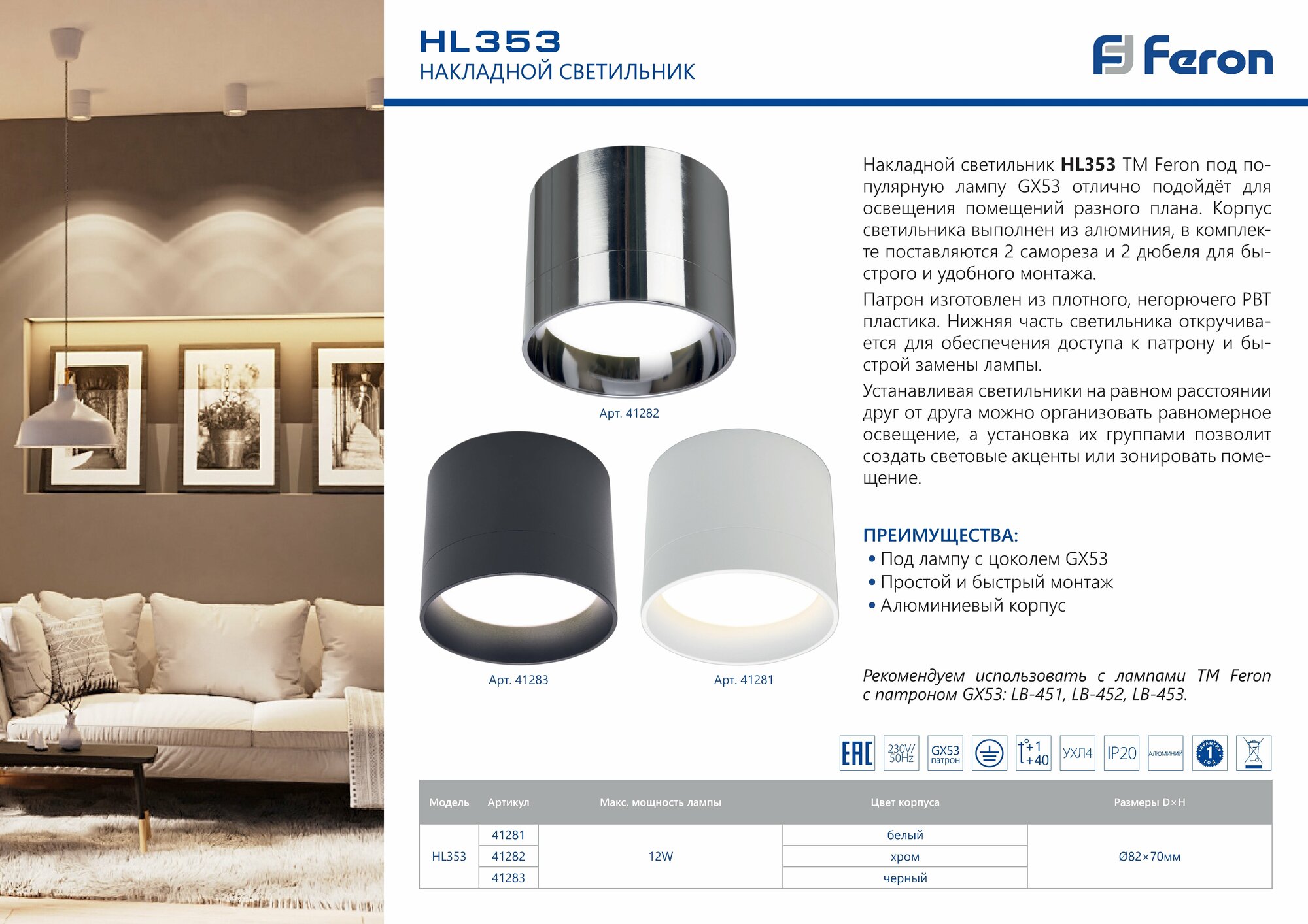 Накладной светильник TM Feron артикул 41282 под популярную лампу GX53 отлично подойдёт для освещения помещений разного плана. Корпус светильника выполнен из алюминия, в комплекте поставляются 2 самореза и 2 дюбеля для быстрого и удобного монтажа. Патрон изготовлен из плотного, негорючего PBT пластика. Нижняя часть светильника откручивается для обеспечения доступа к патрону и быстрой замены лампы. Устанавливая светильники на равном расстоянии друг от друга можно организовать равномерное освещение, а установка их группами позволит создать световые акценты или зонировать помещение.