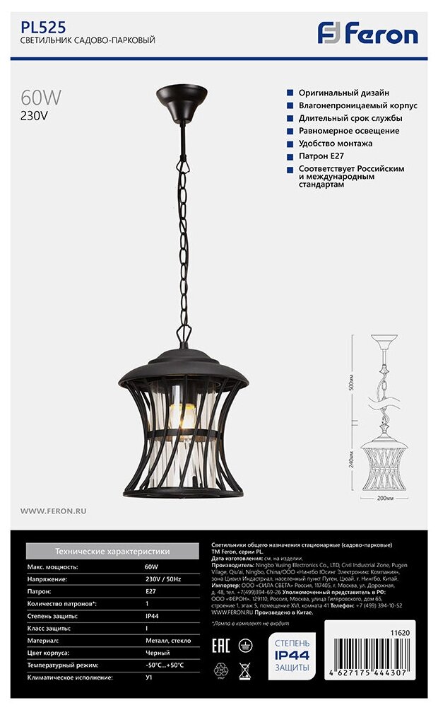 Уличный светильник Feron 11620. Добавит волшебства в атмосферу вашего сада. Размеры 20x20x74 cm. Параметры пылевлагозащиты IP — 44. Использует лампу с цоколем E27. Страна происхождения бренда — РОССИЯ.
