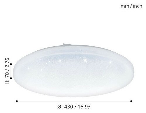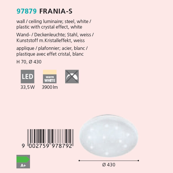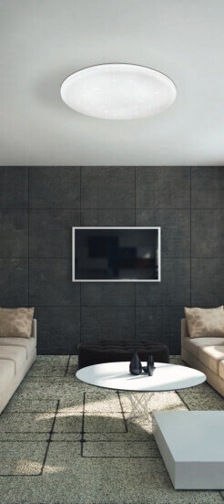 Светильник ''Eglo'' - австрийское качество, стильный дизайн. Для изготовления светильников используются качественные материалы и современные технологии. Настенно-потолочный светильник ''Frania-S'' подходит для основного освещения благодаря мощному LED источнику света. Матовый пластиковый рассеиватель с эффектом хрусталя создает яркое, равномерное освещение. Компактная высота светильника позволяет использовать его в помещениях с низкими потолками.