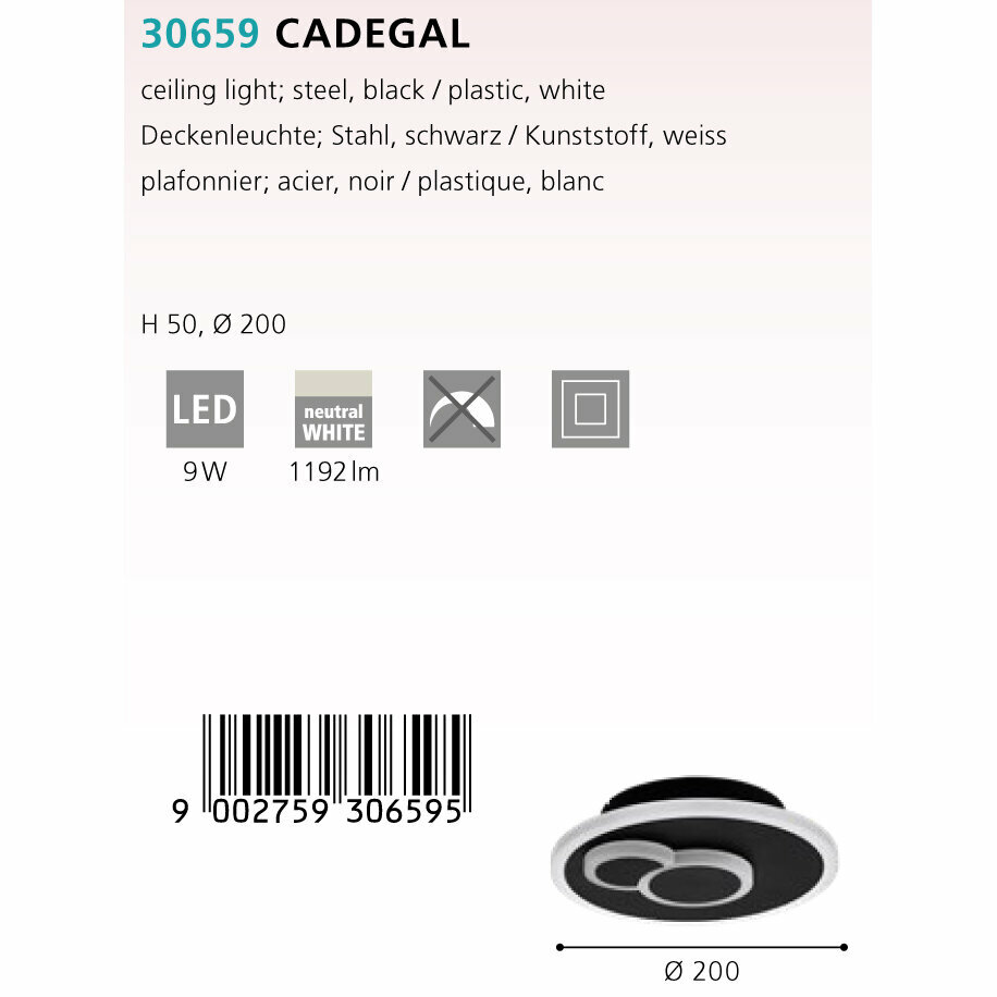 | Номенклатура | 30659 Светильник потолочный CADEGAL, LED 9W, 1192lm, H50, D200, сталь/пластик, черный/белый |