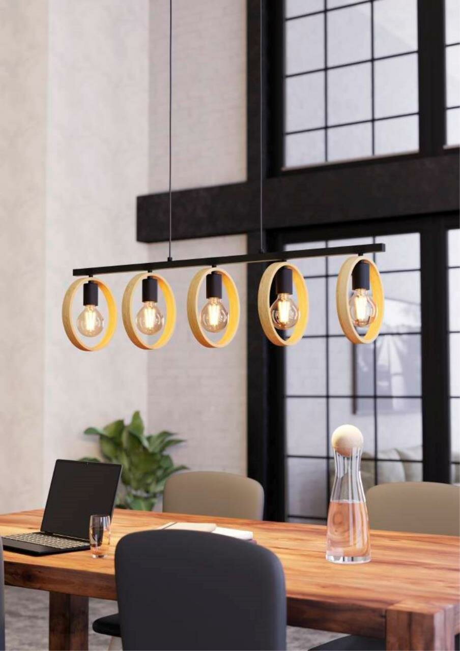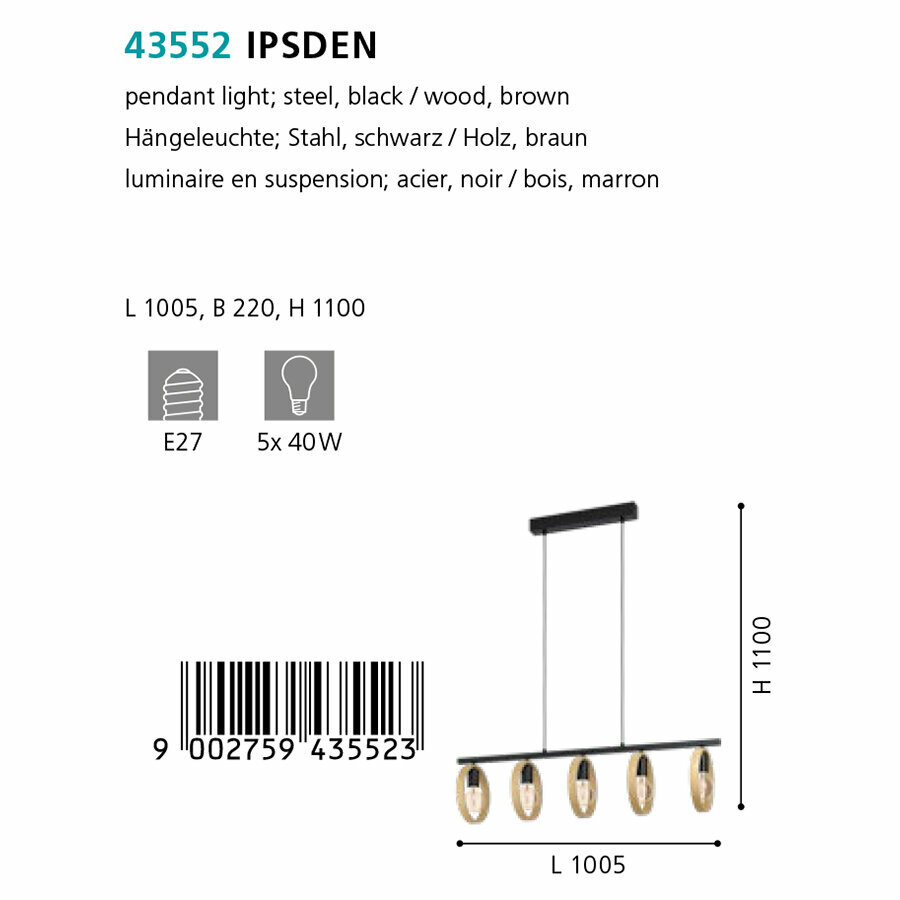| Номенклатура | 43552 Подвесной потолочный светильник (люстра) IPSDEN, 5Х40W, E27, L1005, B220, H1100, сталь/дерево, черный/коричневый |