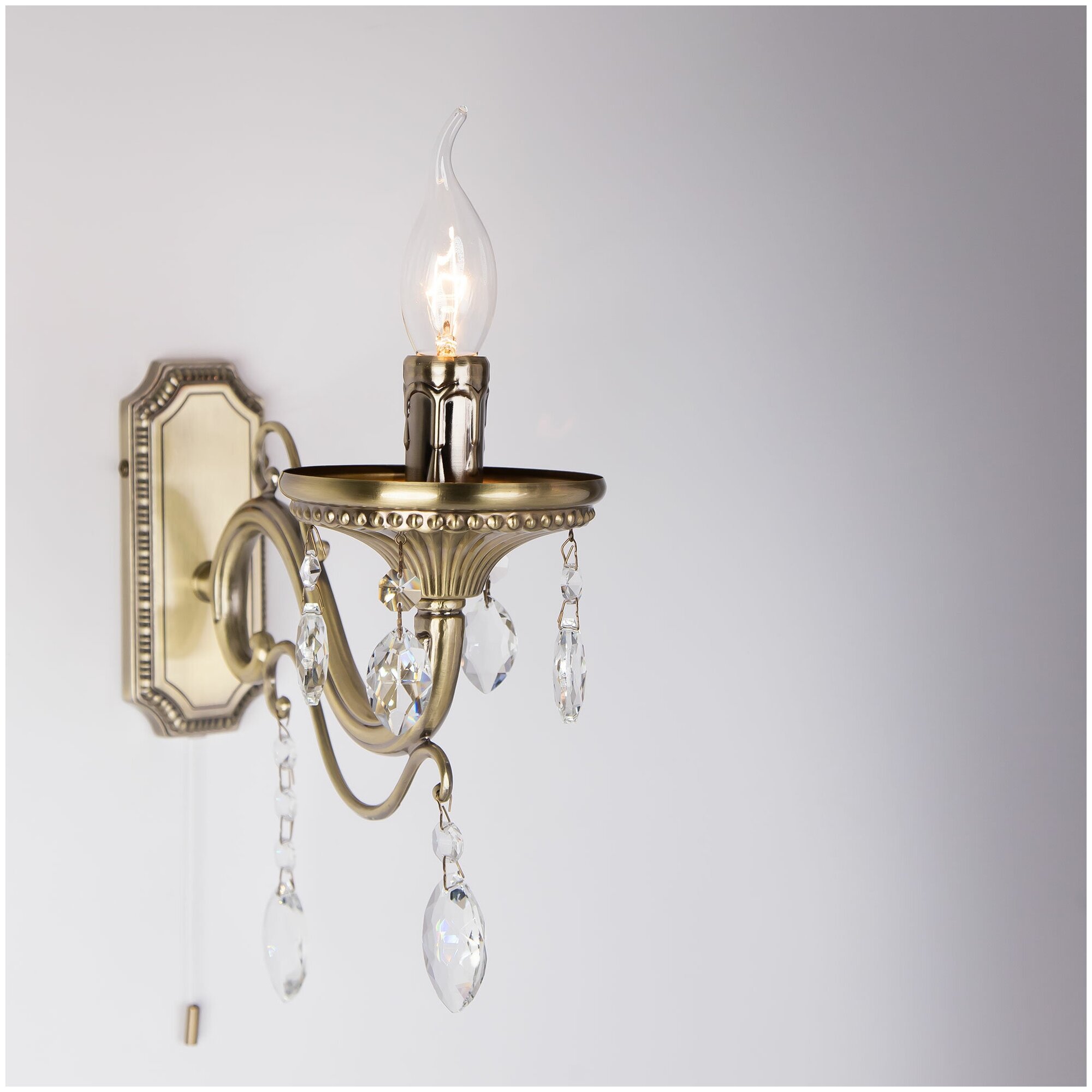 Бра Ситилюкс Кармен CL404313 однорожковое с выключателем, выполнено в классическом стиле. Корпус модели металлический, с литым рожком, цвет бронза. Бра украшено хрустальными подвесками с красивой огранкой. В изделии используется лампа с цоколем Е14 и максимальной мощностью для лампы накаливания 60Вт. Светодиодную лампу можно устанавливать более яркую. Настенный светильник поставляется готовым к установке, тип крепления — планка.