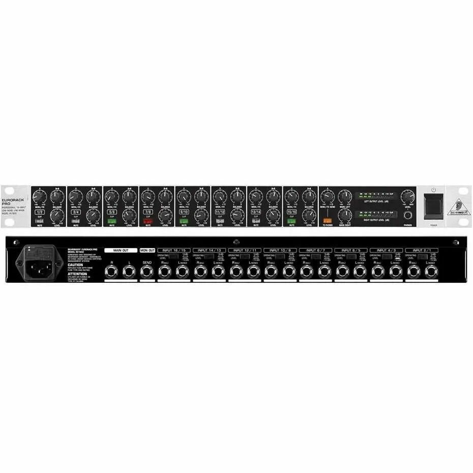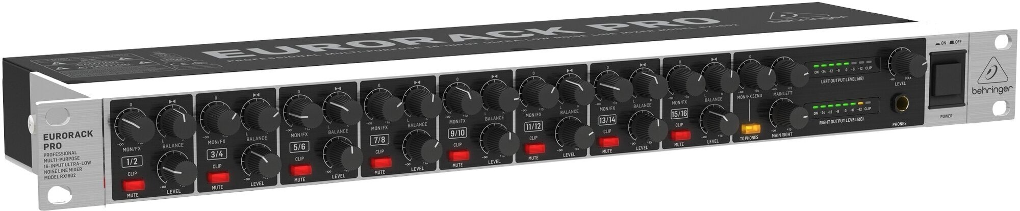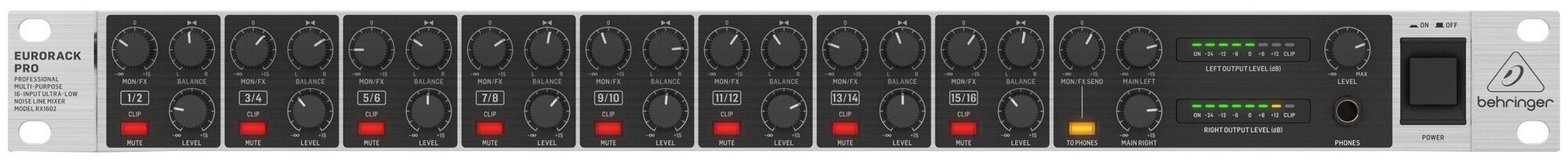Behringer – аналоговый линейный микшер с низким уровнем шумов и имеющий 16 входов. Микшер монтируется в рэковую стойку и имеет высоту 1U. Все входы устройства имеют высокий запас по перегрузке, они могут применяться в комбинациях 8 стереовходов, или 16 монофонических входов или в любой их комбинации и имеют высокий динамический диапазон. Прибор универсален, применим для живых выступлений и для студийной записи, к нему могут быть подключены синтезаторы, семплеры, звуковые модули. Для подключения микрофонов потребуется отдельный внешний преамп.