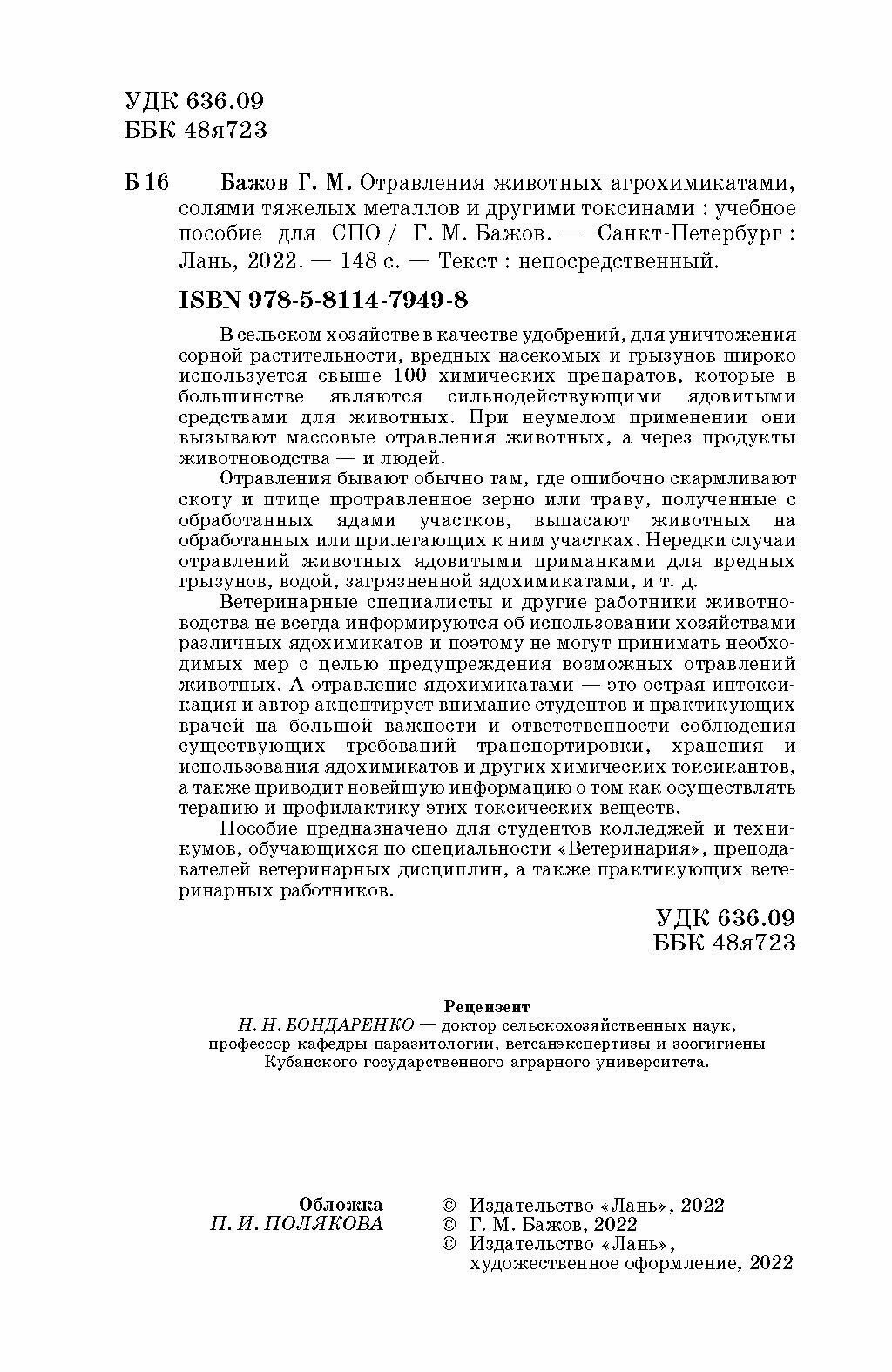 Отравления животных агрохимикатами солями тяжелых металлов и другими токсинами (Г. Бажов); Издательство ЛАНЬ, 2022