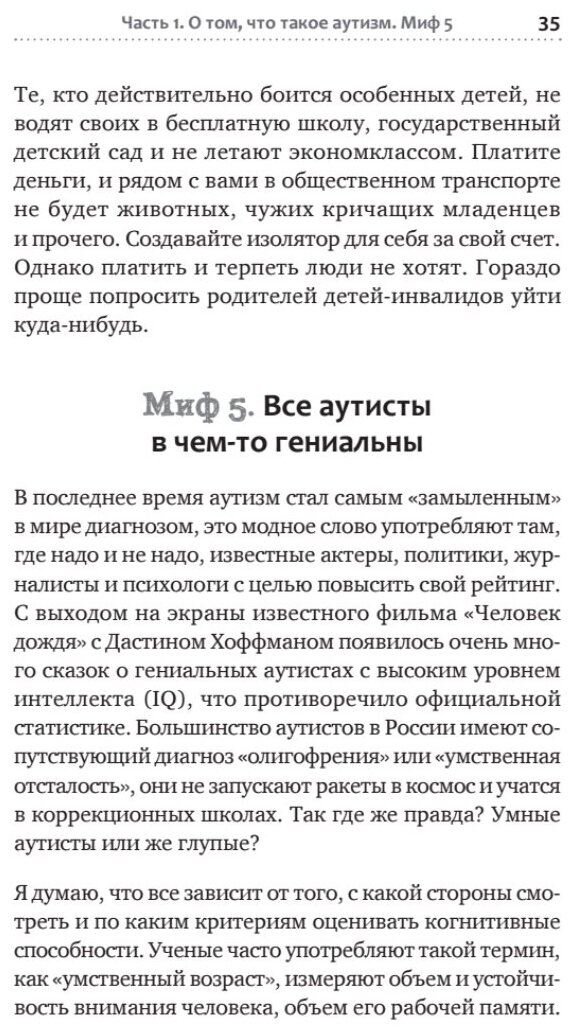 - Цена книги очень демократичная (480 р с учетом скидок), очень содержательный контент. Книга написана очень простым легким языком, опровергает 50 мифов об аутизме и после прочтения ее становится легче на душе. Кажется, будто поговорил с близким другом, с психологом.