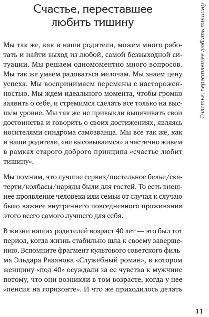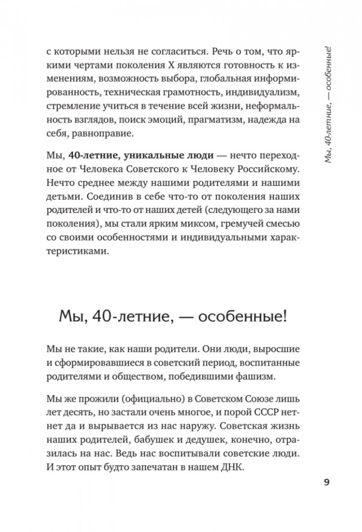 Автор книги - женщина 40 лет, она постоянно упоминает эту цифру, да и в целом не скрывает свой возраст, однако чувствует она себя на 10, а то и 20 лет моложе, и судя по ее словам, люди, которые встречают ее вживую тоже отмечают этот момент. Дело в том, что молодость не в цифрах, и даже не в гладкости кожи, если на то пошло. Молодость в душе. Надежда Трескова написала свою книгу "Новая Надежда" для того, чтобы каждая женщина могло продлить себе 10 лет молодости, вне зависимости от возраста. Однако "40 лет" не просто так фигурирует в повествовании автора. Дело в том, что этот возраст - определенная ступень в жизни женщины, и раньше, у родителей этих женщин, этот возраст был скорее ближе к "концу". Сейчас все изменилось, и благодаря продвижениям в бьюти индустрии, и социуму, но, главное, благодаря возможности внутреннего спокойного состояния. Цель автора в продлении молодости, и для этого она затрагивает все необходимые сферы и первая - психологическая часть - самоощущение, здесь читателю предстоит поработать над своей самооценкой. Следующая часть - энергия - люди, которые вас окружают, ваша семья, ваш дом - место силы. Физиология - работа над телом, правильные отдых и сон, полезные привычки. В перечисленном я коротко изложила содержание книги, все моменты поясняются очень глубоко и тщательно, и именно они влияют на ваше состояние и ваше тело, а значит на вашу жизнь и молодость.