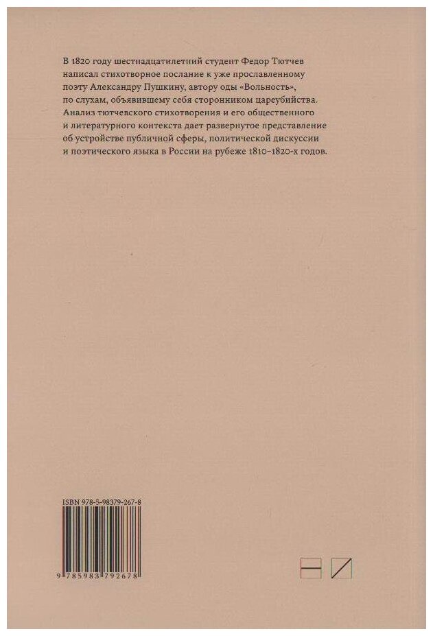 В 1820 году шестнадцатилетний студент Федор Тютчев написал стихотворное послание к уже прославленному поэту Александру Пушкину, автору оды «Вольность», по слухам, объявившему себя сторонником цареубийства. Анализ тютчевского стихотворения и его общественного и литературного контекста дает развернутое представление об устройстве публичной сферы, политической дискуссии и поэтического языка в России на рубеже 1810-1820-х годов.