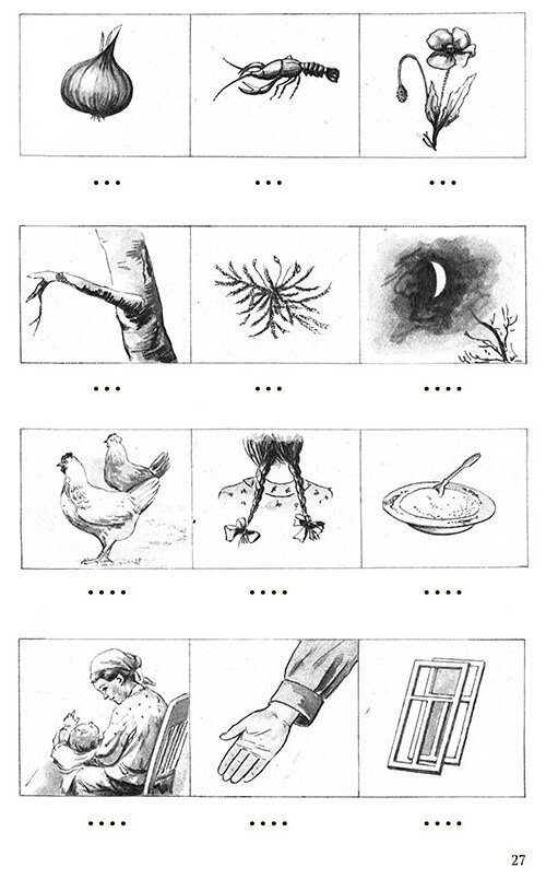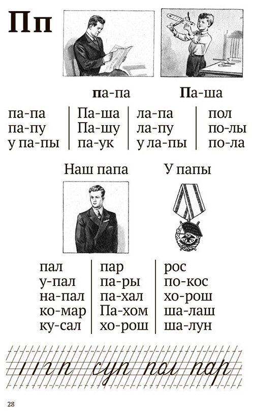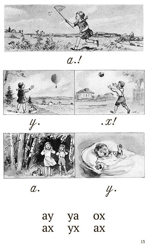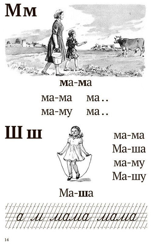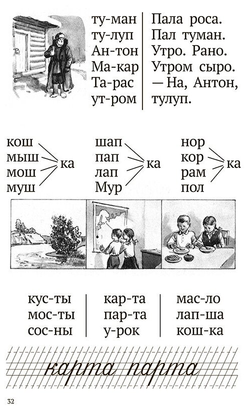 Чтение слов начинается с первых страниц, при этом не обязательно знание алфавита, всё происходит плавно, постепенно.