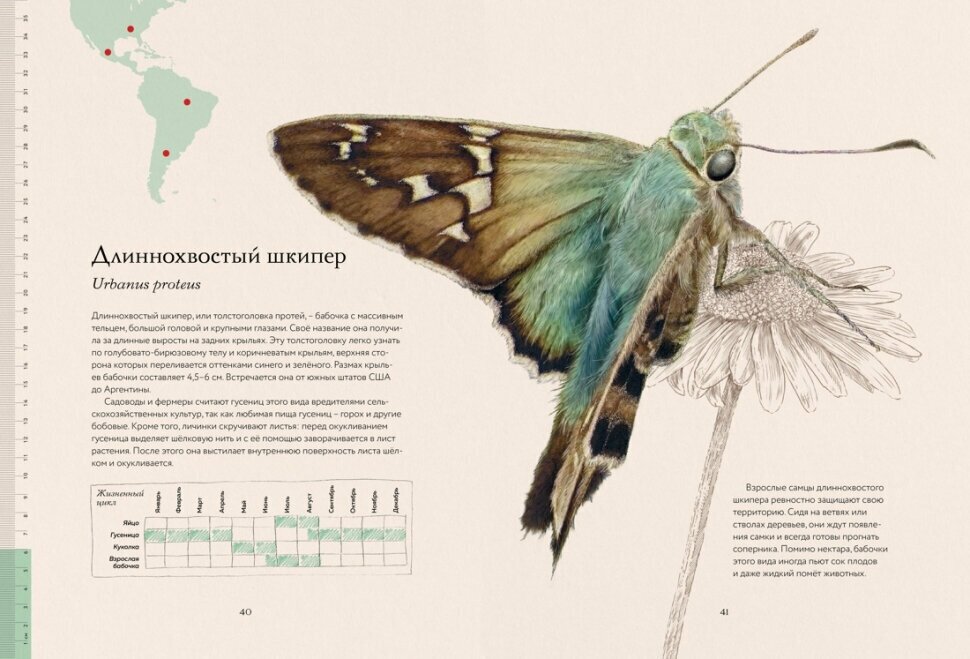 Красивые иллюстрации позволяют рассмотреть представителей разных видов в мельчайших деталях и понять их реальные размеры, а подробные описания каждой бабочки помогут вам лучше узнать о её жизни: где бабочка обитает, чем она питается, как цвет и узор её крыльев помогают ей маскироваться в природе и взаимодействовать с сородичами, и многое другое. Откройте для себя мир бабочек, хрупкий и прекрасный!