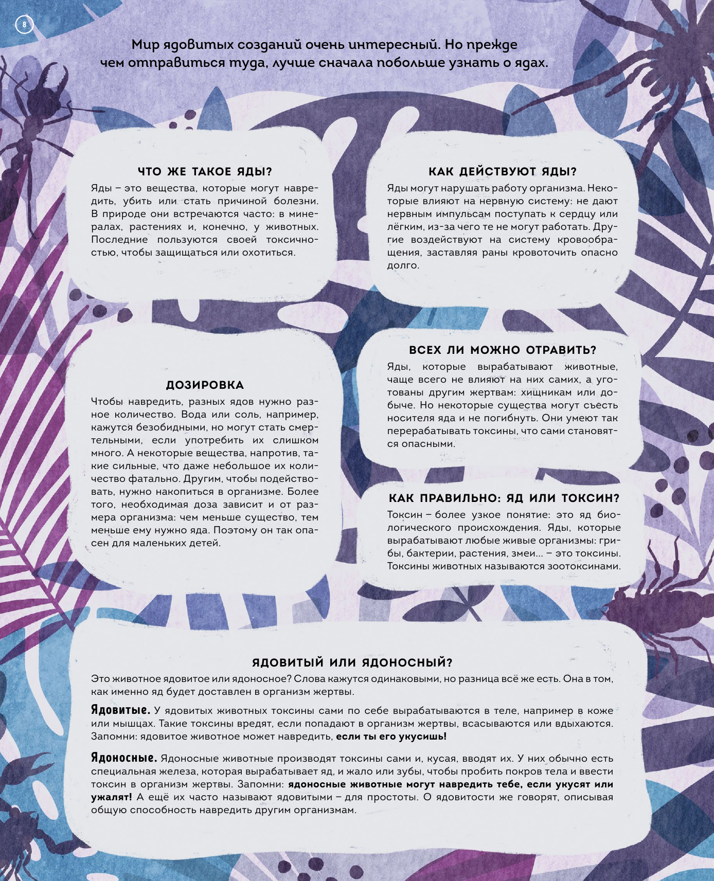 ) иллюстрации животных просто огромные, сюжетные, практически на всю страницу, а вот текста, соответственно и фактов, получается не так много. На первой странице ведётся ознакомление с ядами, так сказать "что такое и с чем его едят"
