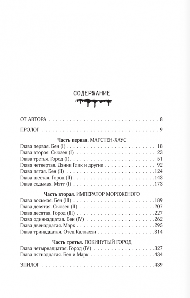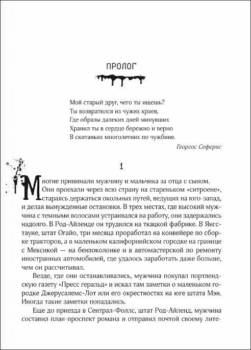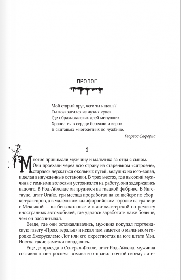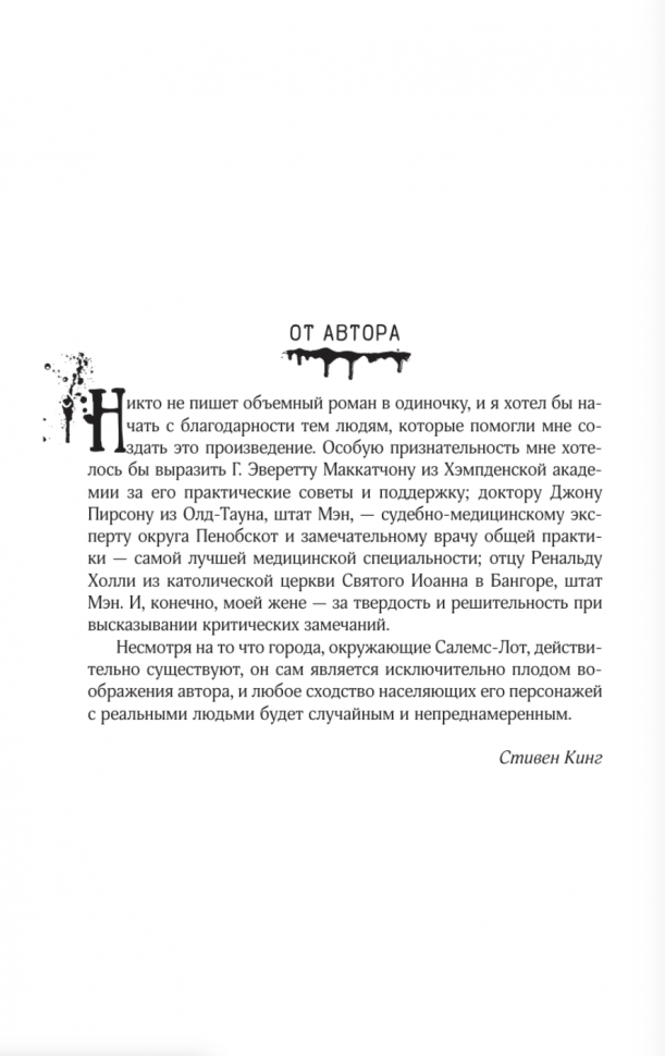 Роман Стивена Кинга, возрождающий интерес к такой теме хоррора как вампиры. Роман переиздан в серии Кинг: Книжная полка. Бумага плотная, текст среднего размера. Обложка в сторожихи тонах, суперобложка. Роман читается очень легко, писатель мастерски закручивает сюжет. Следить за историей персонажей интересно, страх постепенно нагнетается. Обязательно к покупке