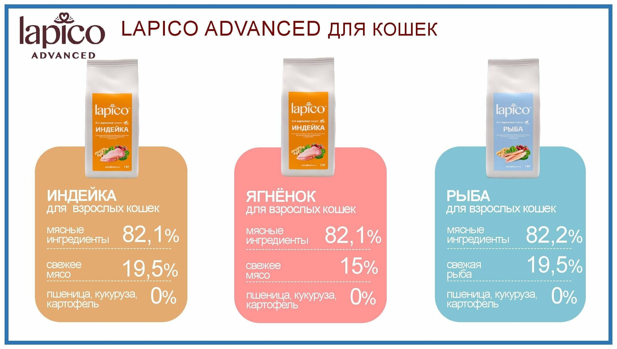 Линейка корма для кошек «Lapico Advanced» содержит более 70% мясных и рыбных ингредиентов, в том числе свежее мясо. Добавление Омега 3 и 6, плюс цельное яйцо. Лучше просто не бывает.