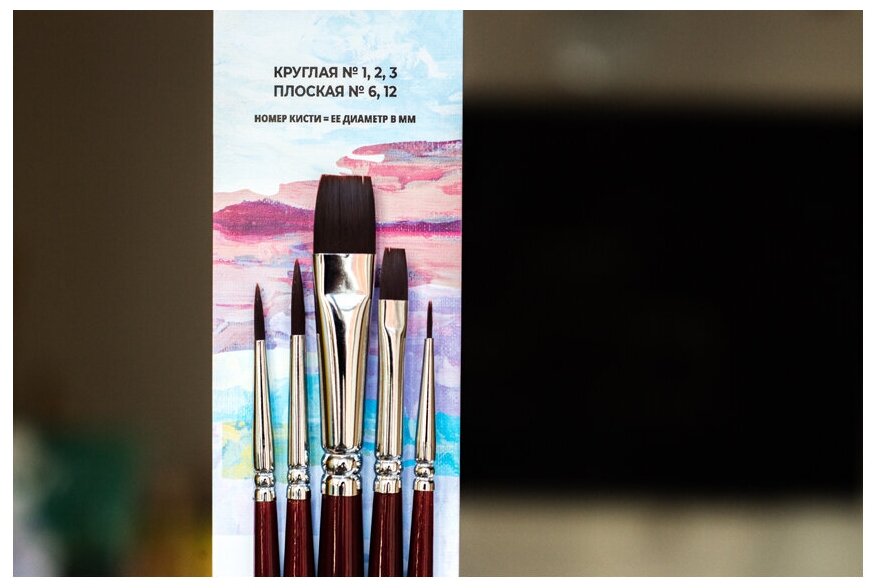 В наборе: круглые кисти № 1, 2, 3, плоские № 6, 12.