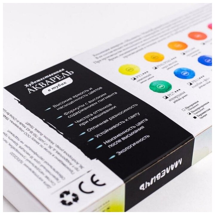 Коллекция акварели Малевичъ разработана совместно с российскими художниками. В её состав входит натуральный гуммиарабик, который признан лучшим связующим для акварели. При производстве используются экологически чистые материалы. Яркие, насыщенные и светостойкие пигменты гарантируют отличную сохранность готовых работ.