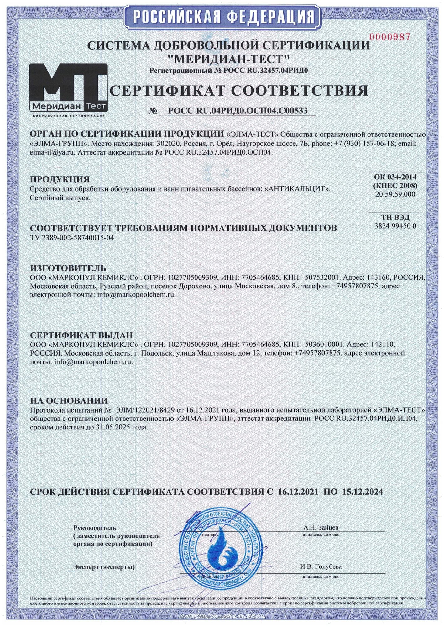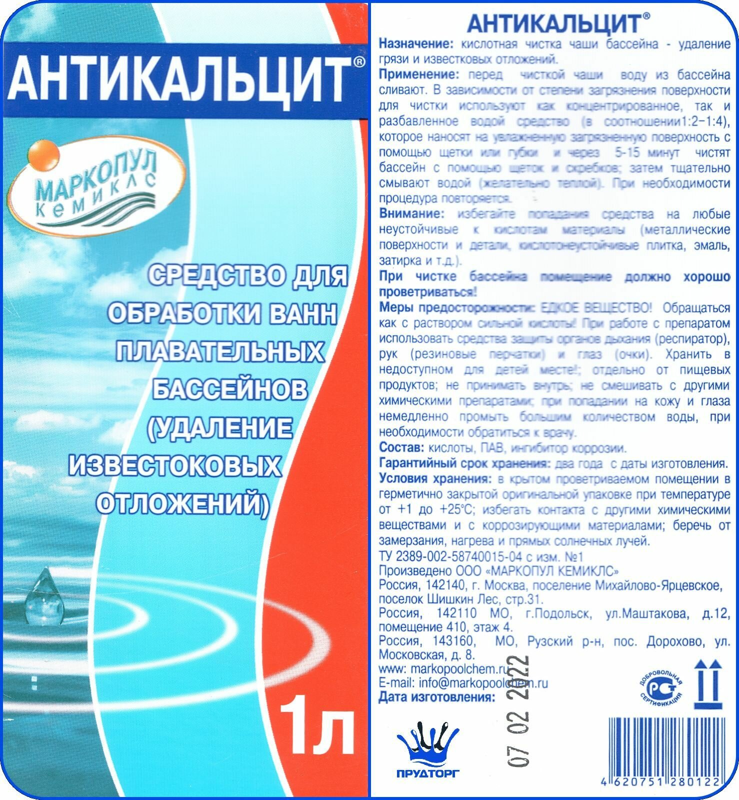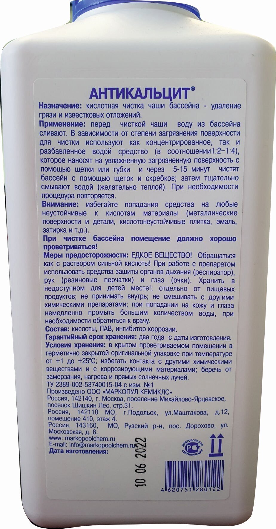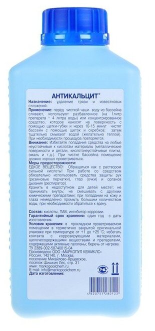 Маркопул Кемиклс Антикальцит Жидкость для очистки стенок бассейна от грязи и известковых отложений 1 л