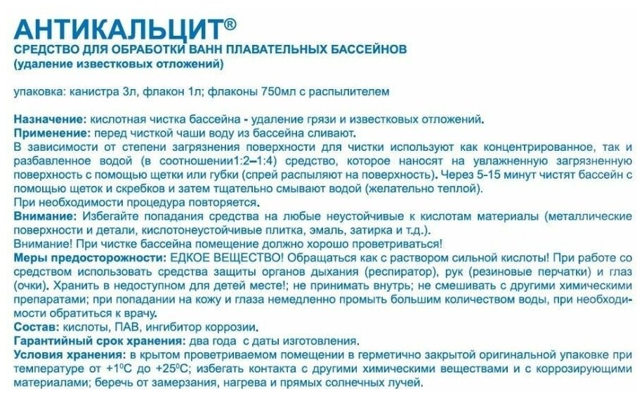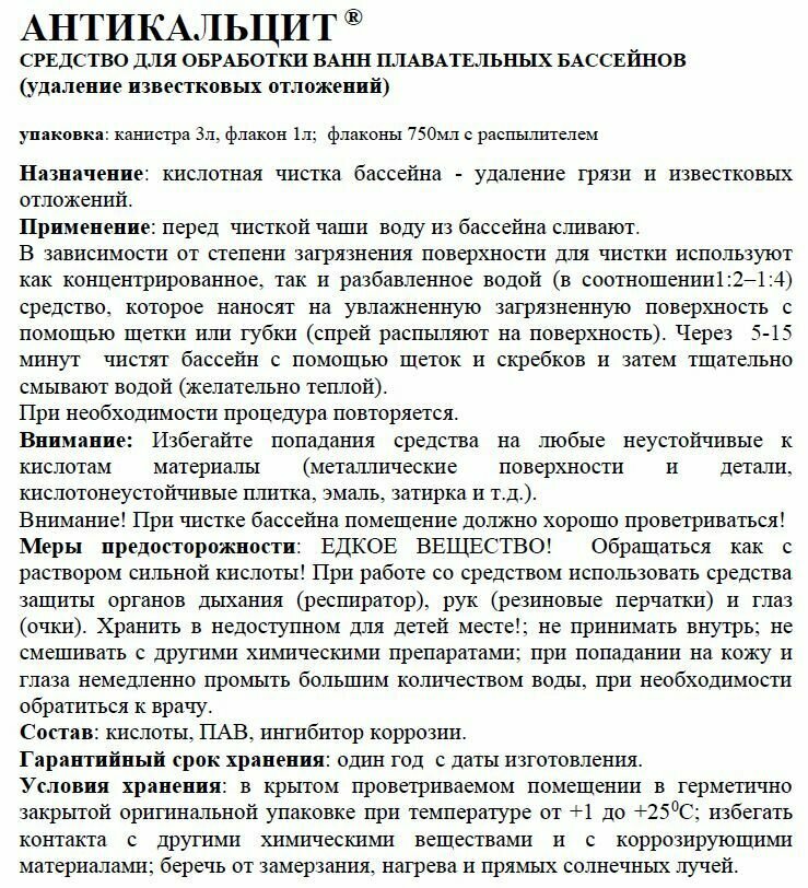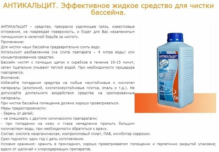 Модель: Антикальцит Жидкость для очистки стенок бассейна от грязи и известковых отложений 1 л