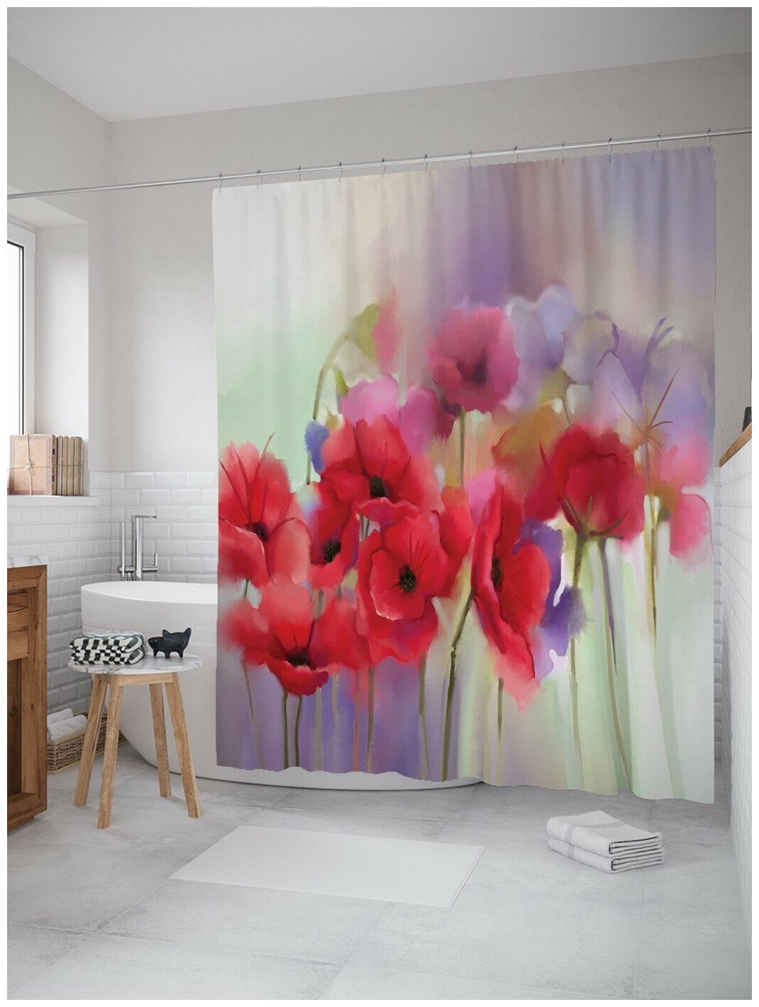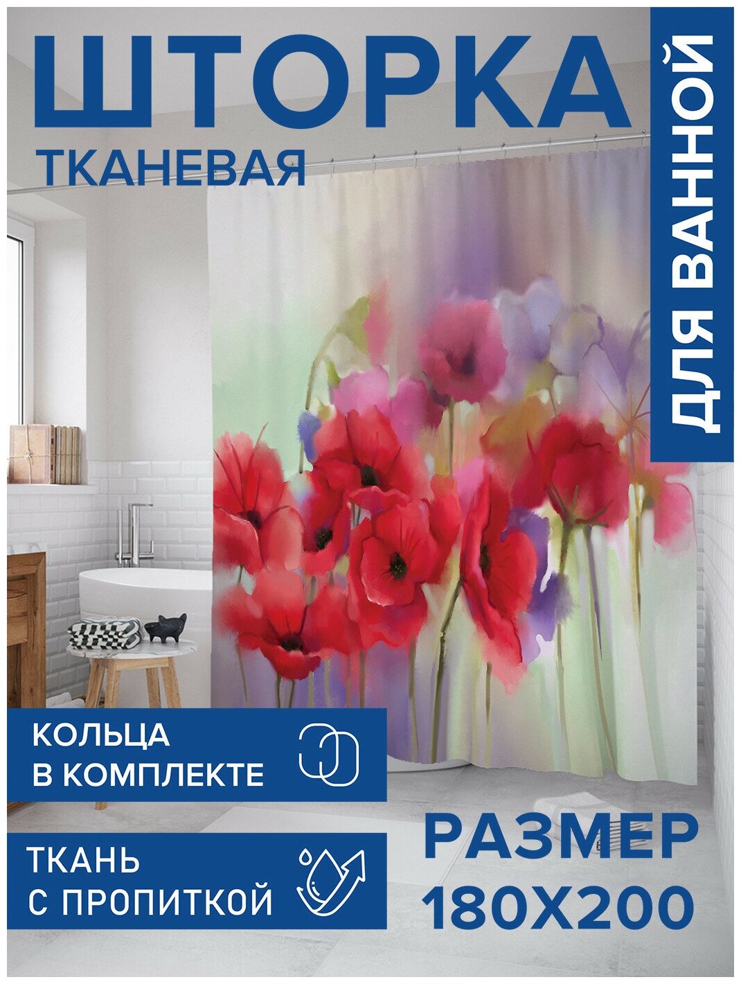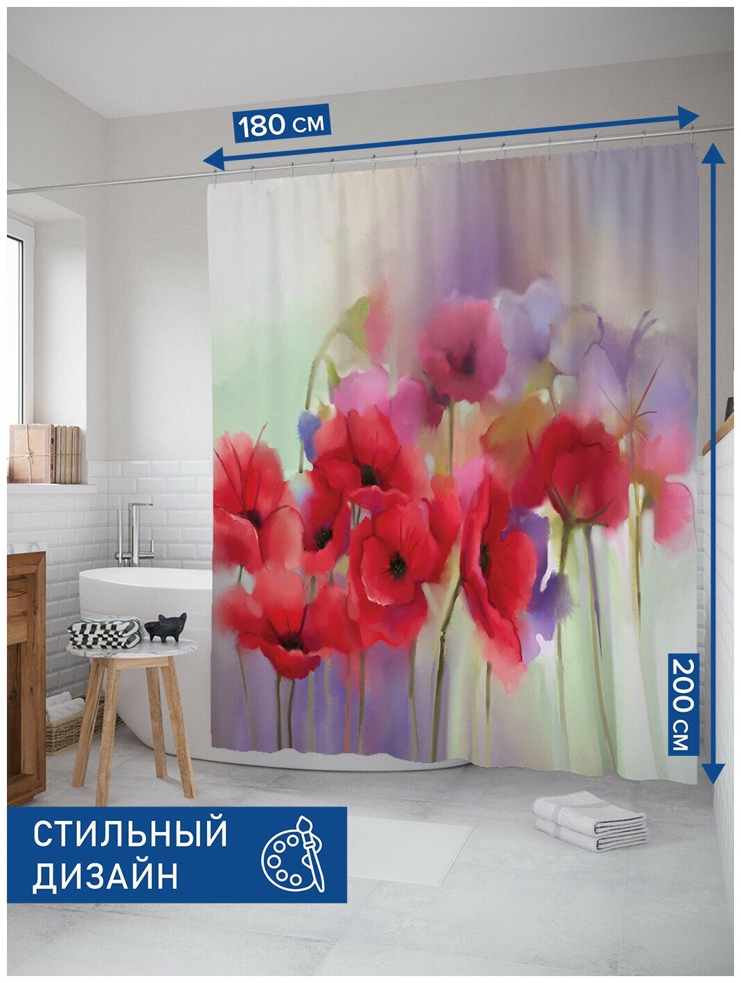 Шторка-занавеска для ванной JOYARTY Штора занавеска из сатена с крючками Маковый туман 200х180 см (размер: 180х200)
