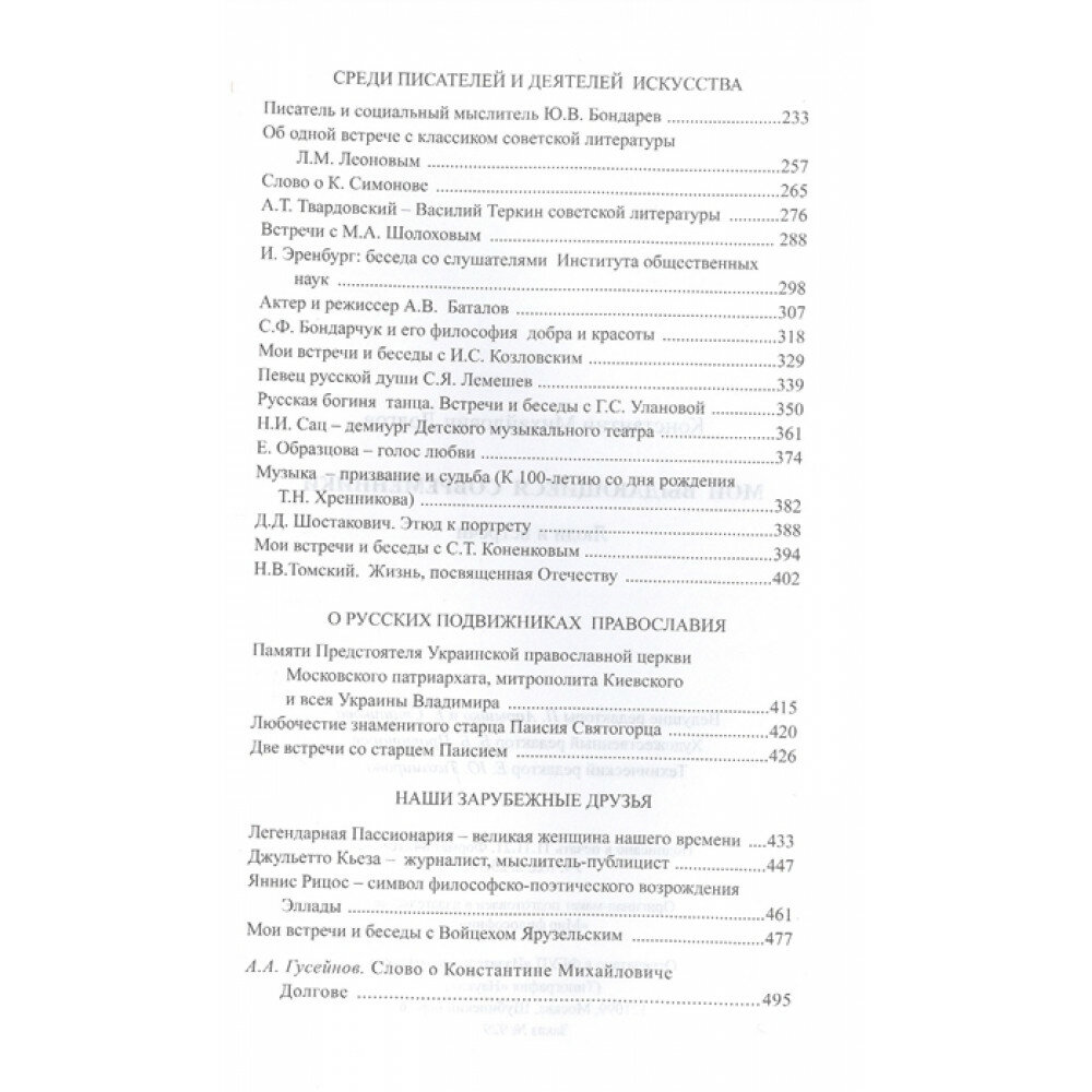 В книге представлены воспоминания и размышления автора о его встречах и беседах с выдающимися деятелями науки и культуры, в том числе с такими, как Л. Леонов, Г. Уланова, С. Коненков, И. Козловский, С. Лемешев, Д. Шостакович, М. Шолохов, Т. Хренников, Н. Сац, Н. Томский, К. Симонов, И. Петровский, Д. Лихачев, А. Лосев, Е. Образцова, А. Баталов и др., с видными политическими и государственными деятелями - А. Громыко, А. Косыгиным, П. Машеровым, Г. Алиевым, Е. Примаковым, Д. Кунаевым, В. Ярузельским и др.