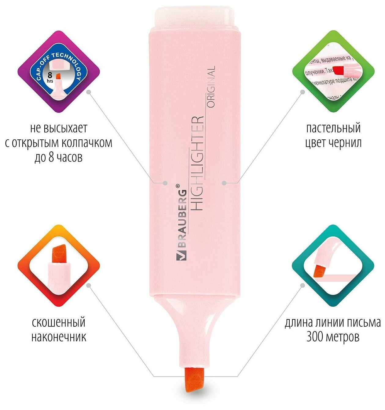 Текстовыделитель BRAUBERG "ORIGINAL PASTEL" предназначен для выделения текста на бумаге любого типа, включая факс-бумагу.