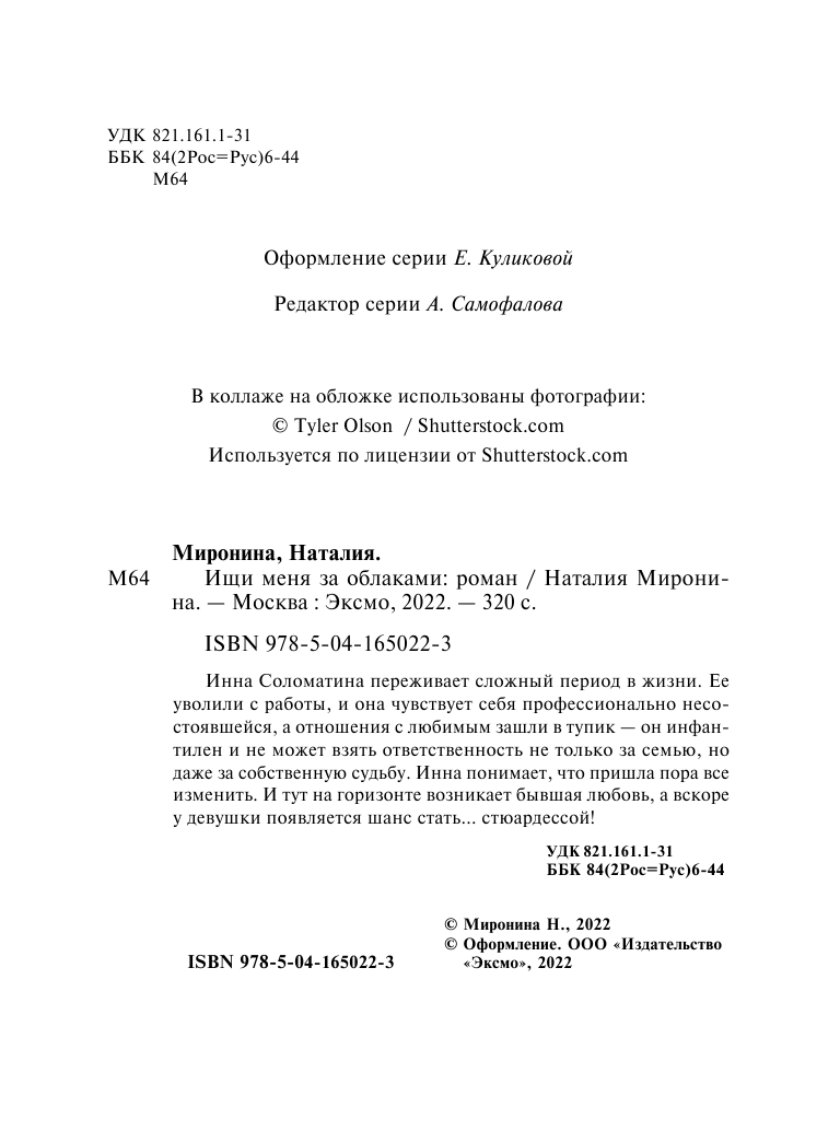Книга: Ищи меня за облаками (Наталия Миронина); Эксмо, Редакция 1, 2022