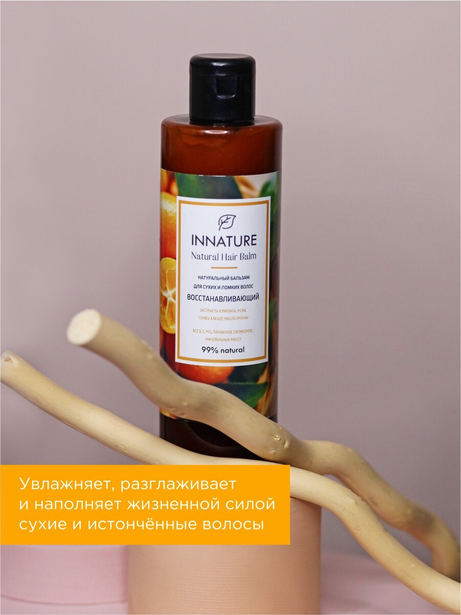 Бальзам для волос iNNature Восстанавливающий натуральный, для сухих и ломких волос. Увлажняет, разглаживает и наполняет жизненной силой истонченные волосы. Аргановое и льняное масла восстанавливают структуру волос, делая их крепкими, здоровыми и эластичными.