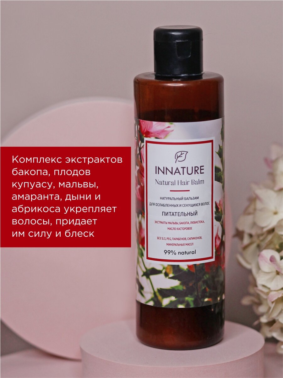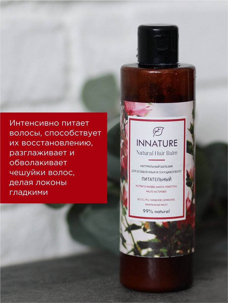 Бальзам для волос iNNature Питательный способствует восстановлению и интенсивному питанию волос, разглаживает и обволакивает чешуйки волос, делает их гладкими. Укрепляет волосы и придает им блеск и жизненную силу. Касторовое и миндальное масла делают структуру более плотной, заполняя повреждения и пустоты, устраняют сухость кончиков.