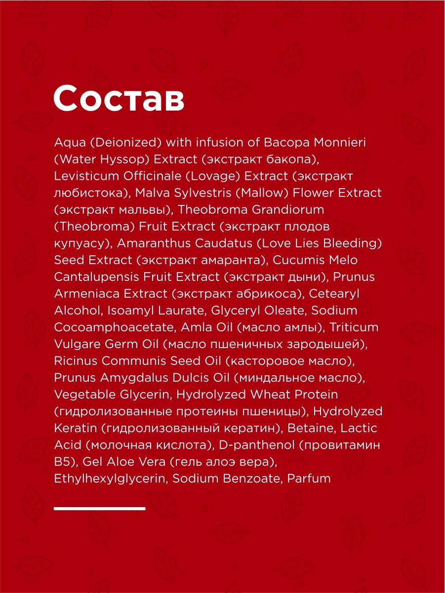 | Состав | deionized water with infusion of bacopa monnieri (water hyssop) extract (экстракт бакопа), levisticum ocinale (lovage) extract (экстракт любистока), malva sylvestris (mallow) flower extract (экстракт мальвы), theobroma grandiorum (theobroma) fruit extract (экстракт плодов купуасу), amaranthus caudatus (love lies bleeding) seed extract (экстракт амаранта), cucumis melo cantalupensis fruit eхtract (экстракт дыни), prunus armeniaca extract (экстракт абрикоса), cetearyl alcohol, isoamyl laurate, glyceryl oleate, sodium cocoamphoacetate, amla oil (масло амлы), triticum vulgare germ oil (масло пшеничных зародышей), ricinus communis seed oil (касторовое масло), prunus amygdalus dulcis oil (миндальное масло), vegetable glycerin, hydrolyzed wheat protein (гидролизованные протеины пшеницы), hydrolyzed keratin (гидролизованный кератин), betaine, lactic acid (молочная кислота), d-panthenol (провитамин в5), gel aloe vera (гель алоэ-вера), ethylhexylglycerin, sodium benzoate, parfum |