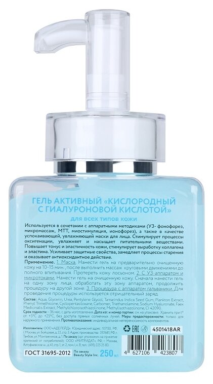 Гель активный Кислородный с гиалуроновой кислотой для всех типов кожи. В основе препарата лежит экстракт алоэ, который насыщает клетки влагой и помогает увлажняющим компонентам сохраниться в глубоких слоях дермы. Повышает упругость и обладает успокаивающим, регенеративным и тонизирующим действием. После использования средства устраняется отечность, пропадают признаки усталости, кожа чувствует себя более свежей и отдохнувшей. Замедляет процессы старения, возвращает лицу сияние. Используется в сочетании с аппаратными методиками (УЗ- фонофорез, микромассаж, МТТ, миостимуляция, ионофорез), а также в качестве успокаивающей, увлажняющей маски для лица.