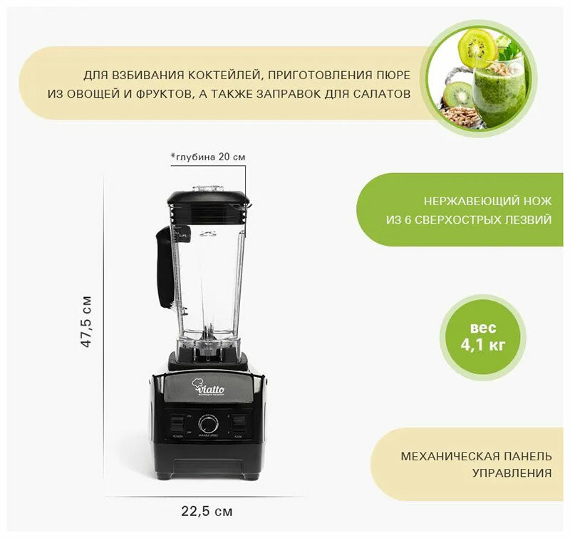 С помощью блендера VIATTO VA-BL1588 можно быстро и качественно измельчить, взбить, смешать любые продукты, приготовить молочные и фруктовые коктейли, смузи, различные десерты, соусы, супы-пюре и многое другое. Модель имеет плавную регулировку скорости и вместительную чашу с мерной шкалой объемом 2 литра, в крышке которой есть отверстие, закрываемое колпачком, для добавления ингредиентов непосредственно во время работы.