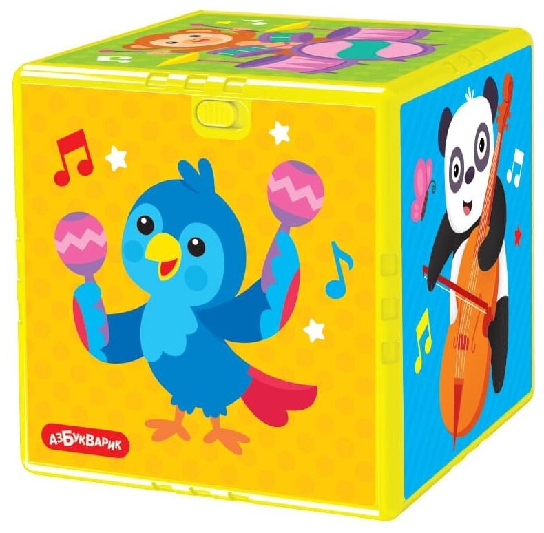 Каждая зверюшка играет на своём музыкальном инструменте! Так в игровой форме кроха познакомится со зверюшками зоопарка и запомнит, как называются и звучат разные музыкальные инструменты. Веселые песенки, песенки про зверят, мелодии с забавными звуками! Игрушка представляет собой пластиковый кубик, на гранях которого изображены яркие сюжетные иллюстрации, все его грани озвучены.