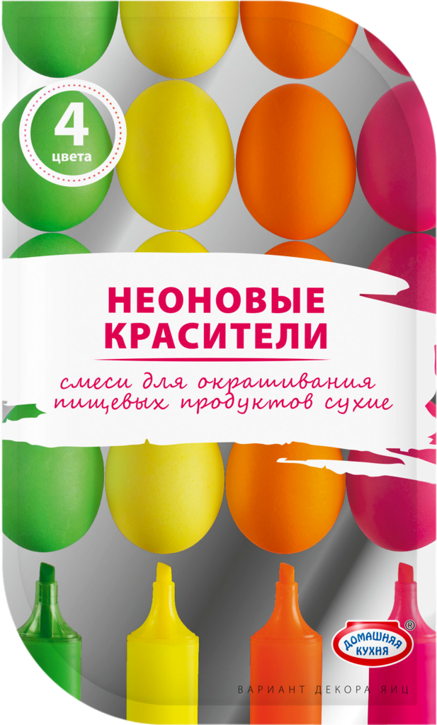 Традиционным блюдом на праздник Пасха всегда были крашеные яйца. Их преподносят гостям и близким людям. Предлагаем яркие пасхальные краски для яиц в наборе. Красители представлены 4 неоновыми цветами предназначенных для создания пасхальных композиций из яиц и кулича любой формы или пряника в виде пасхального кролика.Красители идут в виде таблеток, которые разбавляются уксусом. Цвет будет равномерным и насыщенным, если следовать инструкции производителя. Вы можете покрасить яйца дома, использовать пищевые красители для мастики или маршмеллоу. Окрашенные яйца можно украсить наклейками или декупажем, а затем переложить их в тарелку, корзинку или другую посуду. Они будут отлично смотреться на праздничном столе в пасочнице рядом с творожным десертом или шоколадным печеньем.Крашенные яйца создают особенную атмосферу и поднимают настроение. Особенный восторг они вызывают у детей. Мы предлагаем сертифицированный продукт, который безопасен для здоровья.