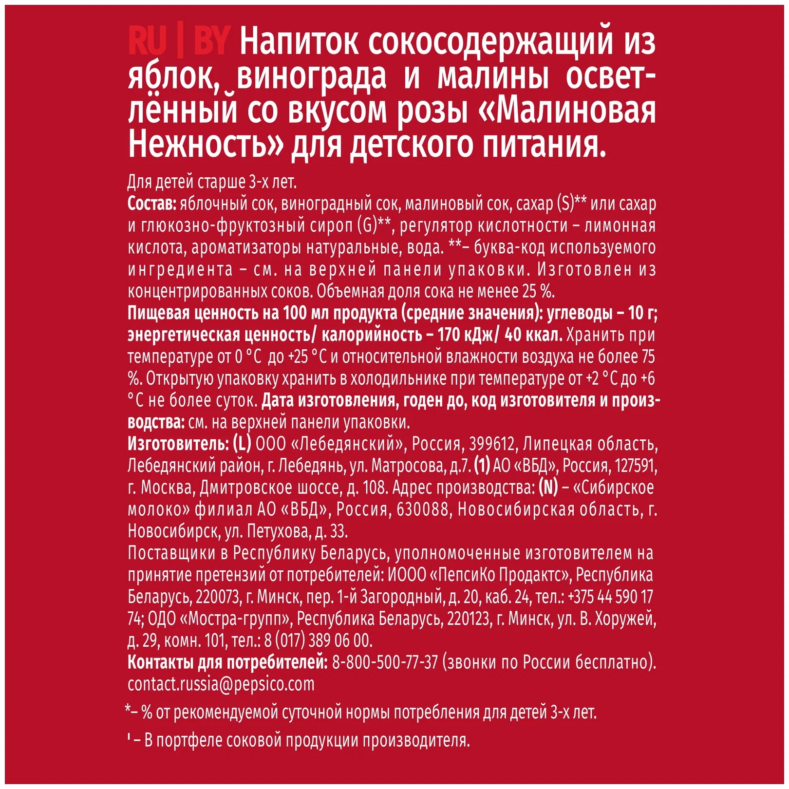 Напиток сокосодержащий Любимый Малина: вкус и польза для здоровьяНатуральный состав: напиток содержит яблочный, виноградный и малиновый соки, а также сахар, лимонную кислоту, натуральные ароматизаторы и воду. Благодаря такому составу, напиток обладает насыщенным вкусом малины и содержит витамины, необходимые для поддержания здоровья.Без ГМО: напиток не содержит генетически модифицированных организмов, что делает его безопасным для употребления.Энергетическая ценность и содержание углеводов: в 100 г напитка содержится 40 ккал и 10 г углеводов, что делает его отличным выбором для тех, кто следит за своим питанием и стремится к здоровому образу жизни.Упаковка и количество: напиток поставляется в удобной упаковке тетрапак, которая содержит 12 штук.Произведено в России: напиток сокосодержащий Любимый Малина производится в России, что гарантирует высокое качество и соответствие стандартам.Выбирая напиток сокосодержащий Любимый Малина, вы получаете вкусный, полезный и натуральный продукт, который станет отличным дополнением к вашему рациону и заботе о здоровье.