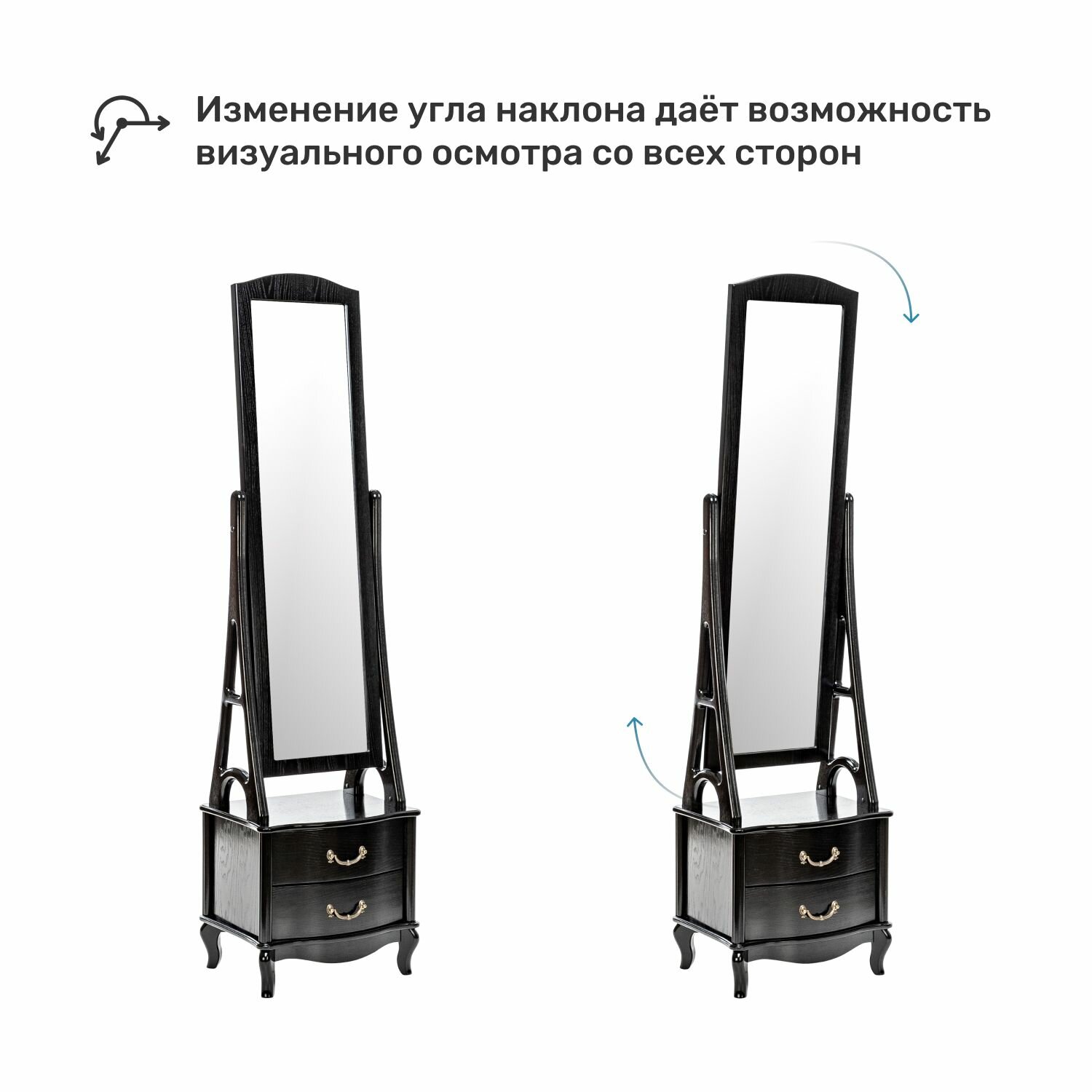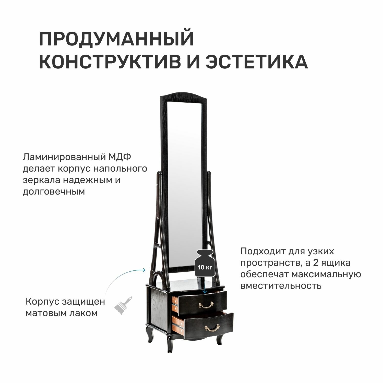 Будучи функциональным предметом обстановки, напольное зеркало Афина одновременно способно стать украшением интерьера. Модель будет органично смотреться в спальне, стиль которой тяготеет к классике или модерну. Яркая деталь конструкции – удерживающие раму боковые стойки: их очертания напоминают узнаваемый силуэт Эйфелевой башни. Основание представляет собой тумбу с двумя выдвижными ящиками, в которые удобно складывать косметику, фен, щетки и стайлеры для волос. Фасады из МДФ отделаны натуральным ясеневым шпоном. Изделие устойчиво и не нуждается в дополнительной фиксации к стене или другой мебели.