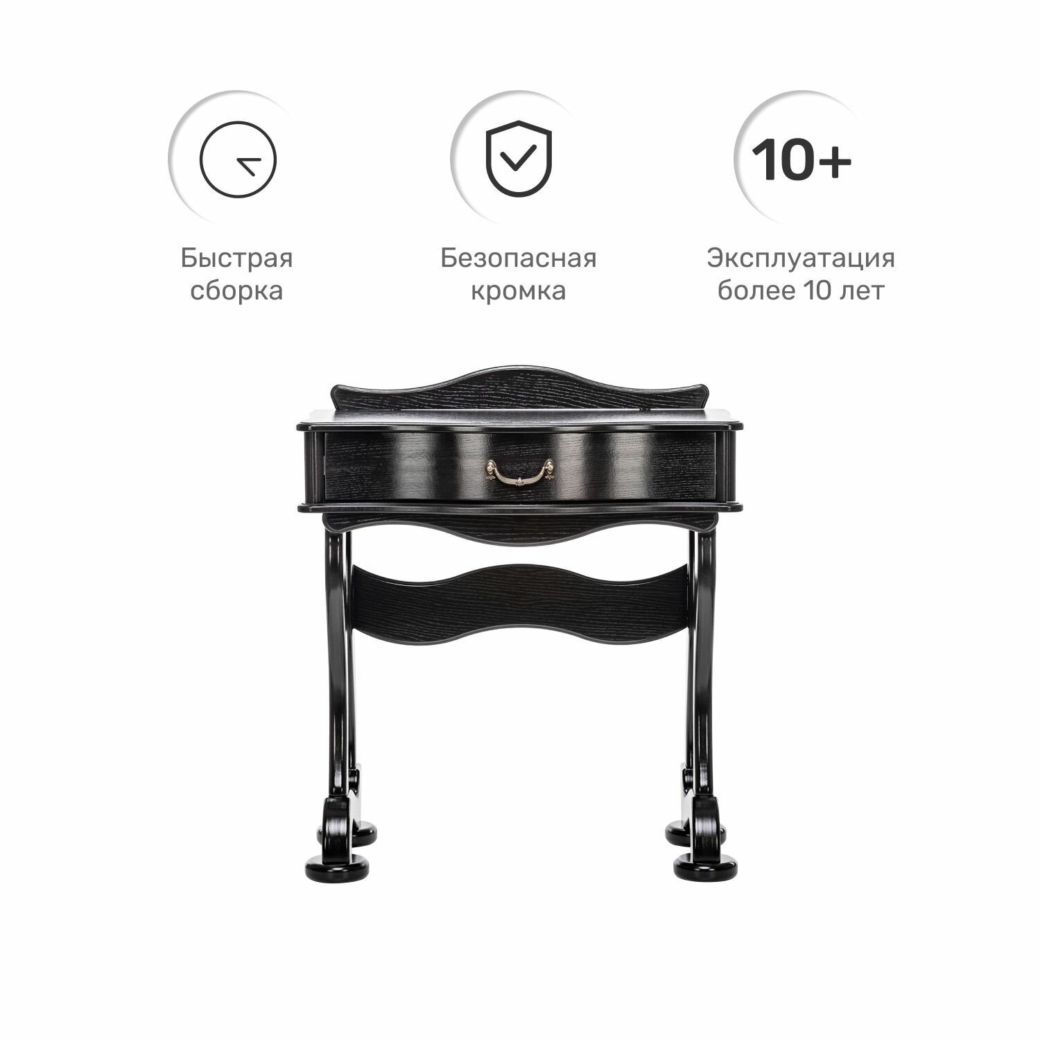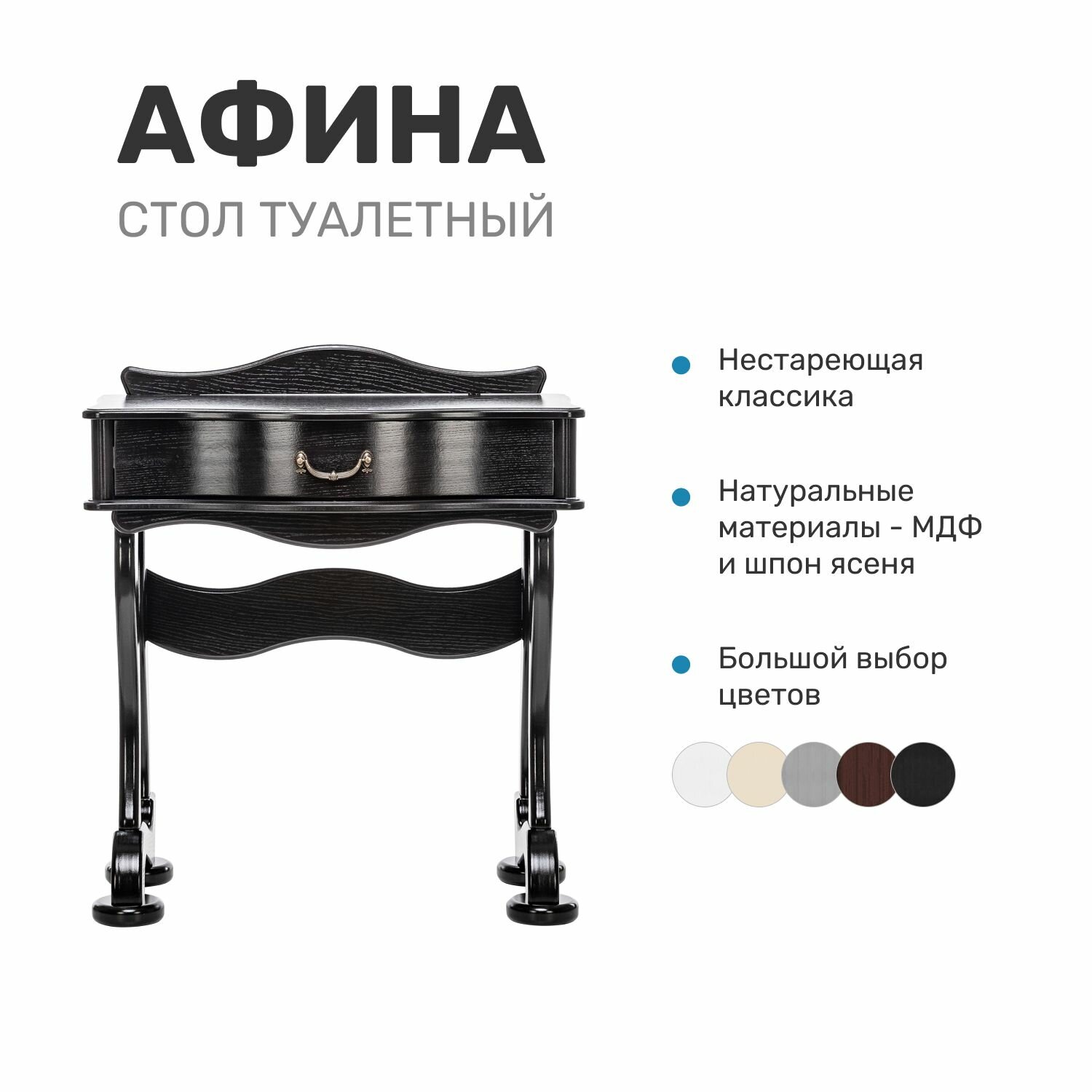Туалетный стол поможет создать если и не полноценный дамский будуар, то уютный личный уголок в спальне, где можно с комфортом нанести макияж и довести до совершенства прическу. При общей компактности модели выдвижной ящик достаточно велик, чтобы в нем нашлось место для декоративной и уходовой косметики, бижутерии, аксессуаров для волос. Столик с изящным фризом, волнистой линией фасада и винтажной патинированной ручкой привнесет в современную обстановку очарование классического стиля.