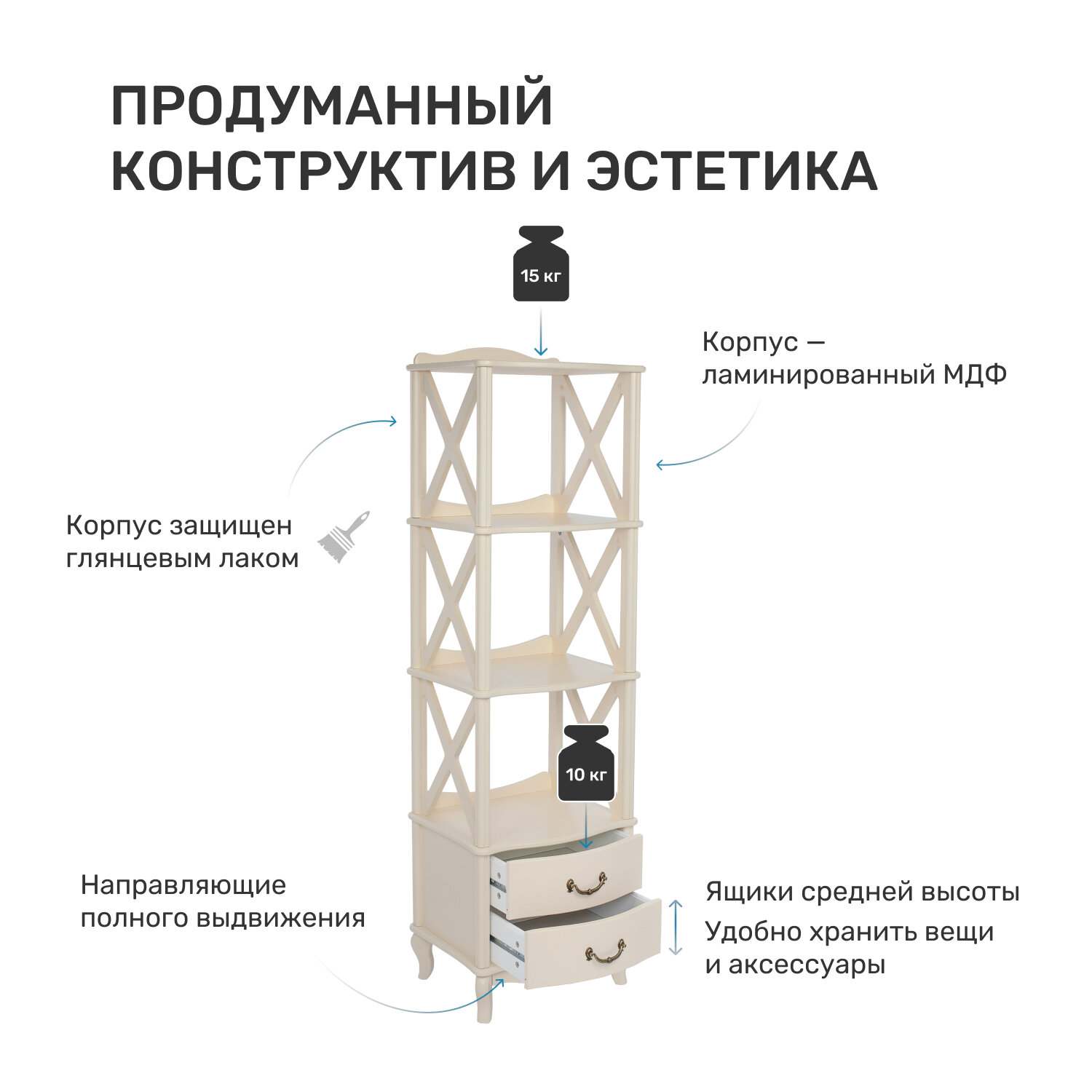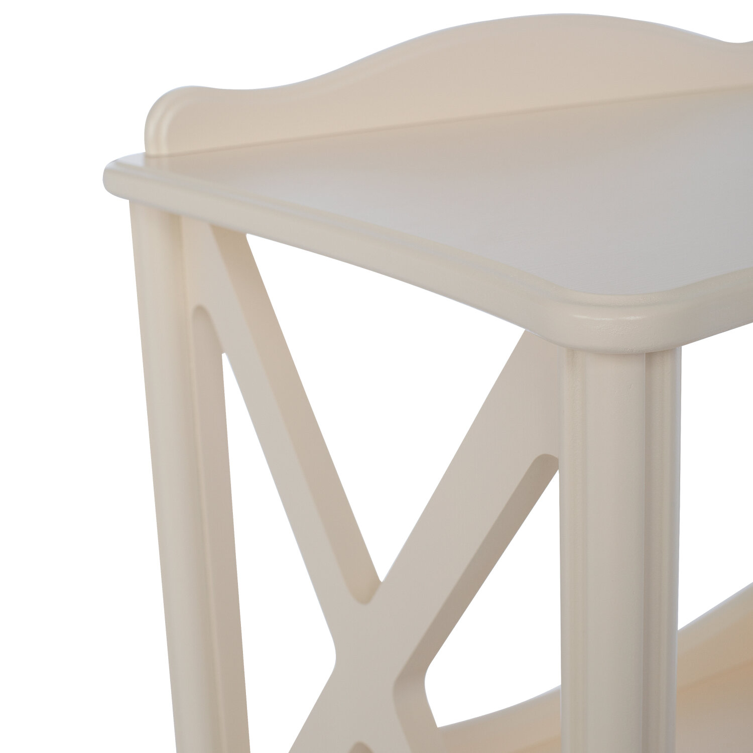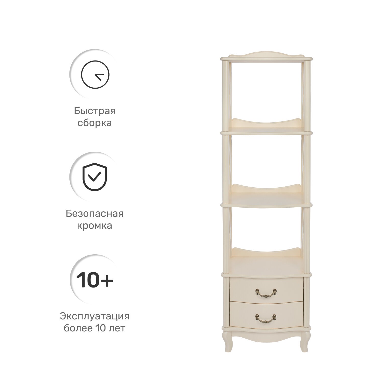 Этажерка-стеллаж Афина предназначена для демонстрации эффектных предметов декора. Открытые полки позволяют хорошо видеть все, что на них расставлено: изысканные вазы, статуэтки, коллекции редкостей, спортивные кубки, семейные реликвии. Вместо боковых стенок использованы X-образные переплеты, создающие ощущение легкости. Задняя сторона каждого яруса дополнена невысоким ограничительным бортиком, предотвращающим падение аксессуаров при их перестановке или вытирании пыли. Модель с гнутыми ножками в неоклассическом стиле изготовлена из шпонированного и окрашенного МДФ.
