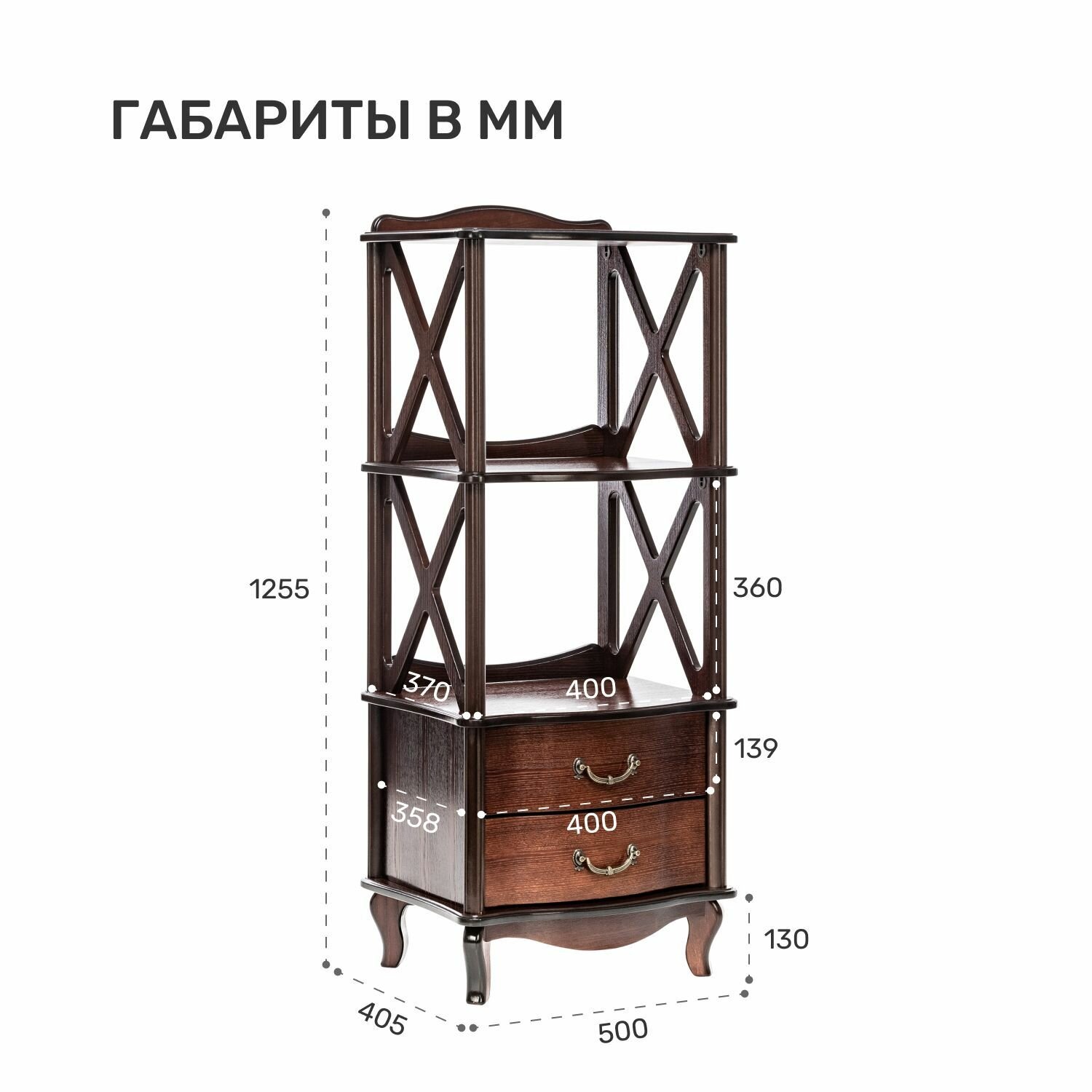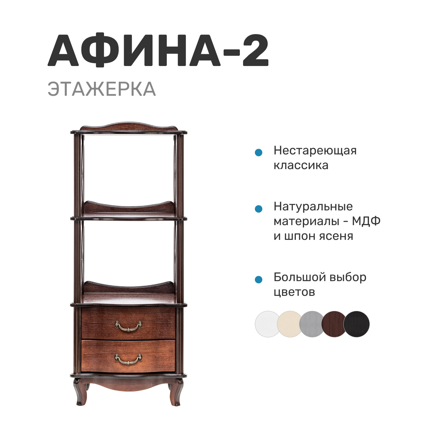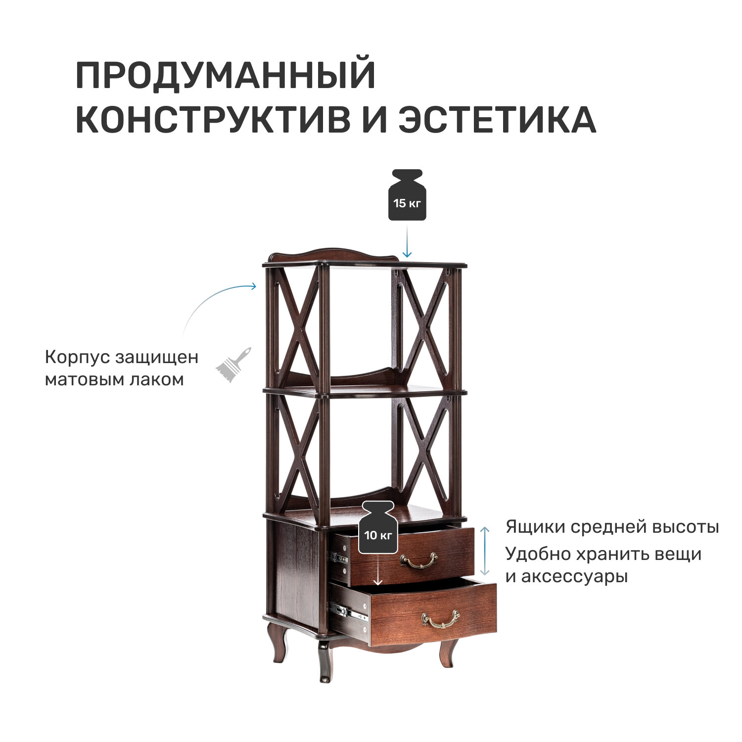 Интерьер гостиной или спальни выиграет, если его дополнить этажеркой Афина, выполненной в неоклассическом стиле. Модуль сочетает функции мини-стеллажа и комода: для размещения красивых предметов декора предназначены открытые полки, в выдвижных ящиках можно спрятать множество необходимых мелочей. Вместо сплошных боковых стенок использованы скрещивающиеся планки, с любой стороны открывающие обзор на фарфоровые статуэтки, винтажные вещицы из бронзы, коллекцию морских раковин. Высота каждого яруса составляет 36 см – на это можно ориентироваться при выборе аксессуаров для экспозиции.