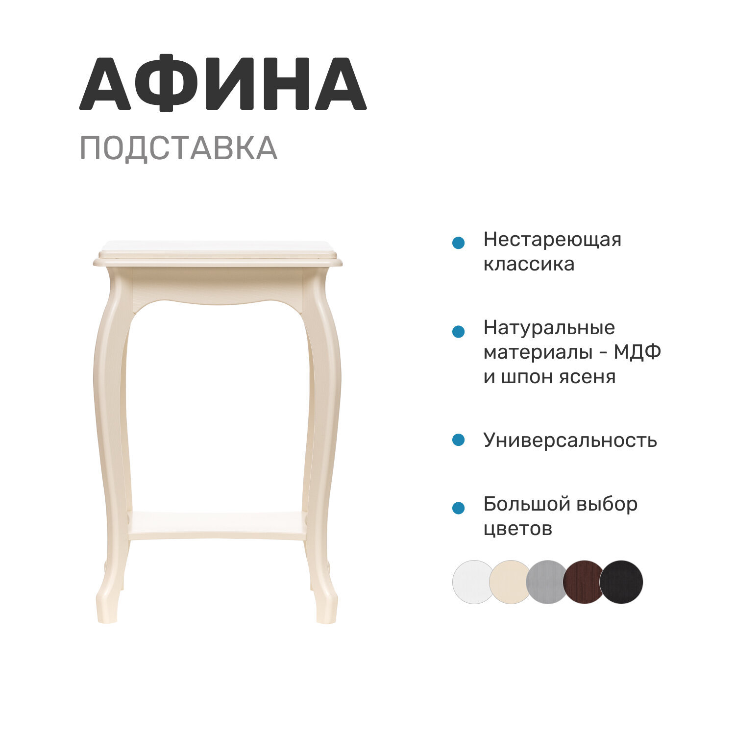 Подставка Афина — это изящный столик-консоль, появление которого в вашей комнате добавит обстановке изысканного шарма. На столешнице будет выигрышно смотреться статуэтка, дизайнерская инсталляция или большая ваза — конструкция выдержит вес до 15 кг. Можно использовать эту модель и как жардиньерку под цветочное кашпо или как миниатюрный туалетный столик. Изготовлена подставка из шпонированной МДФ, но выглядит как резное изделие из массива благородного дерева. Изящные линии вызывают ассоциации с мебелью из дворцовых гостиных, созданной руками именитых мастеров.