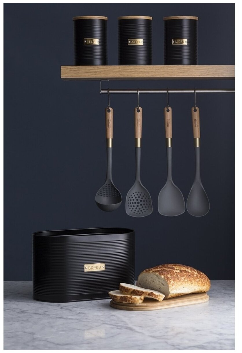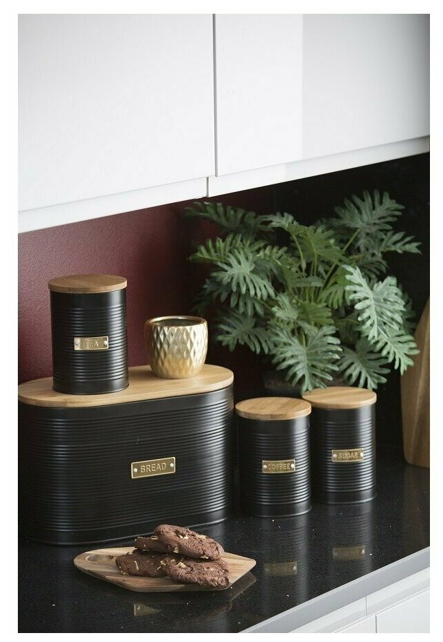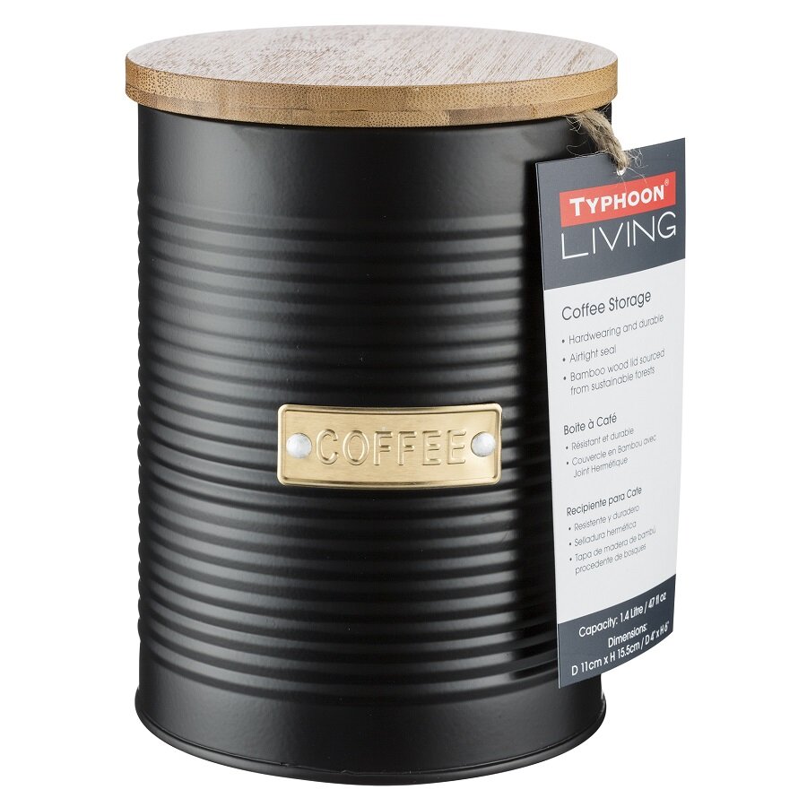 Емкость для хранения кофе Otto поможет организовать рабочее пространство на вашей кухне. Эргономичный контейнер выполнен из эмалированной стали, стойкой к коррозии и деформации. Бамбуковая крышка с воздухопроницаемым уплотнителем из силикона продлевает свежесть продуктов и защищает их от воздействия влаги. При создании изделия дизайнеры используют золотистый декор, который безупречно сочетается с матовым покрытием черного цвета. Благодаря этому емкость добавит элегантности классическому и современному интерьеру кухни. Брэнд: TYPHOON (Великобритания) Материал: эмалированная сталь, бамбук, силикон Цвет: черный Размер: 11,5 х 15,9 х 11,5 см Объем: 1,4 л