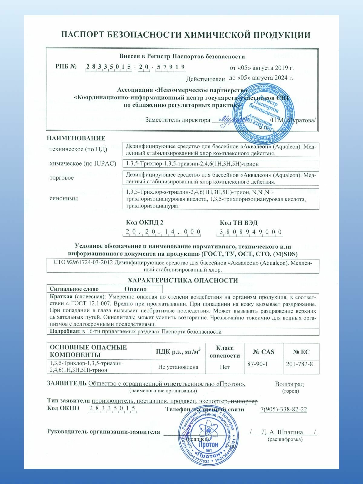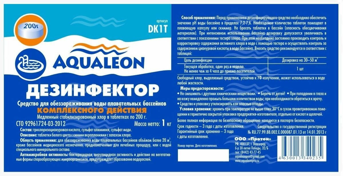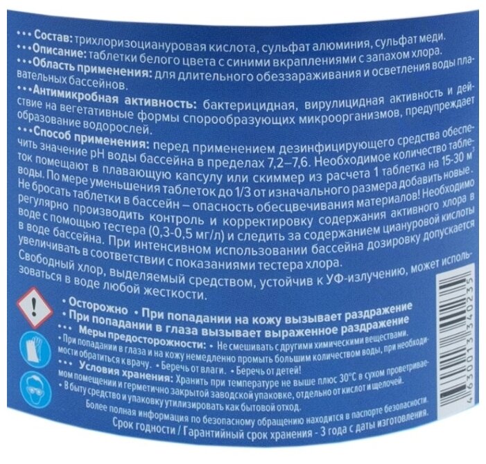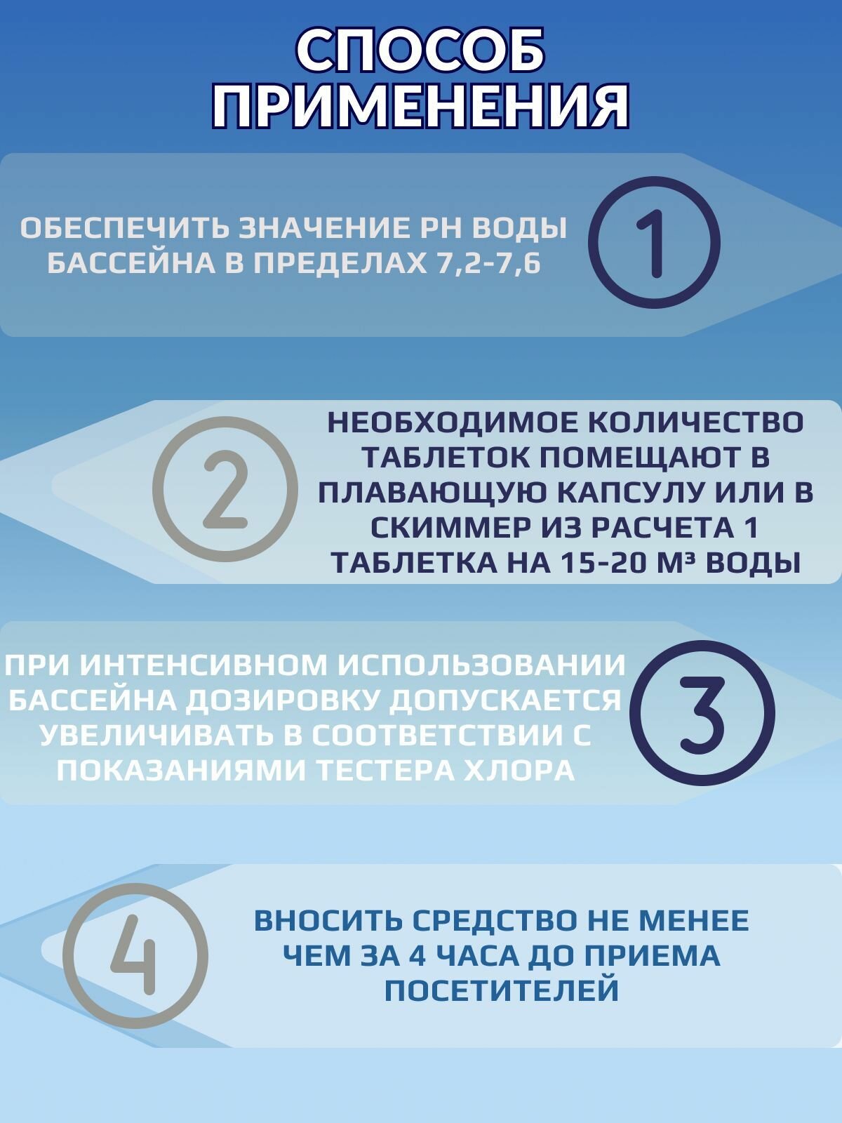 | Способ применения | Перед применением дезинфицирующего средства необходимо обеспечить значение рН воды бассейна в пределах 7,2-7,6. Необходимое количество таблеток помещают в плавающую капсулу или в скиммер. |