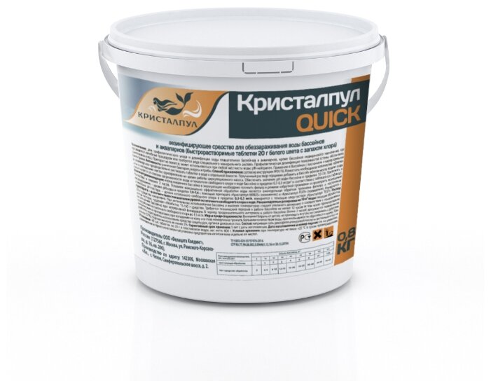 «Кристалпул Quick» содержит натриевую соль дихлоризоциануровой кислоты и активный хлор. Средство борется с бактериями, грибами и вирусами, вызывающими загрязнение и помутнение воды в плавательных бассейнах и аквапарках. «Кристалпул Quick» содержит натриевую соль дихлоризоциануровой кислоты и активный хлор. Средство борется с бактериями, грибами и вирусами, вызывающими загрязнение и помутнение воды в плавательных бассейнах и аквапарках. Расход препарата определяется практическим путём, исходя из необходимости поддержки уровня хлора в воде — от 0, 3 до 0, 5 мг/л. Значение рН обрабатываемой жидкости при этом должно постоянно находиться в пределах 7–7, 4.