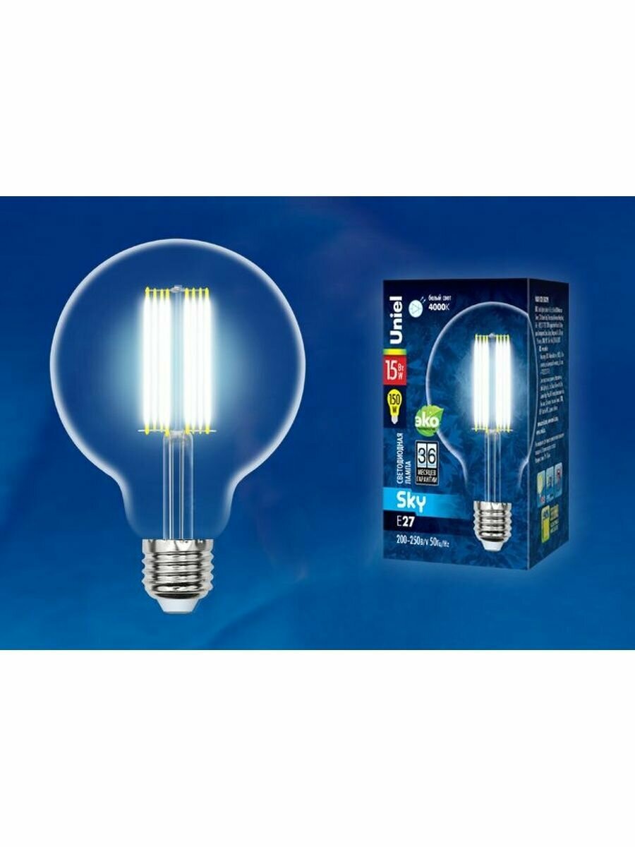 На сегодняшний день товар «Филаментная светодиодная лампа E27 10W 4000K (белый) Sky Uniel LED-G95-15W-4000K-E27-CL PLS02WH (UL-00004865) LED-G95-15W/4000K/E27/CL PLS02WH картон» можно купить с кешбеком в 1 магазине: Яндекс.Маркет