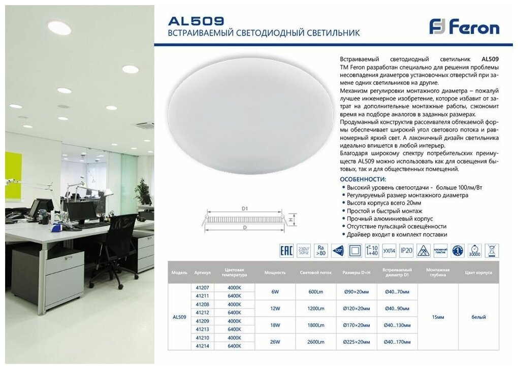 Встраиваемый светильник светодиодный 41210 - продукт известной компании Feron (Китай). Имеет максимальную мощность 26 Вт, освещает площадь до 5.2 кв. м. Отлично подойдет для таких мест, как гостиная, кафе, кухня, офис, магазин. Впишется в интерьеры следующих стилей: современный.