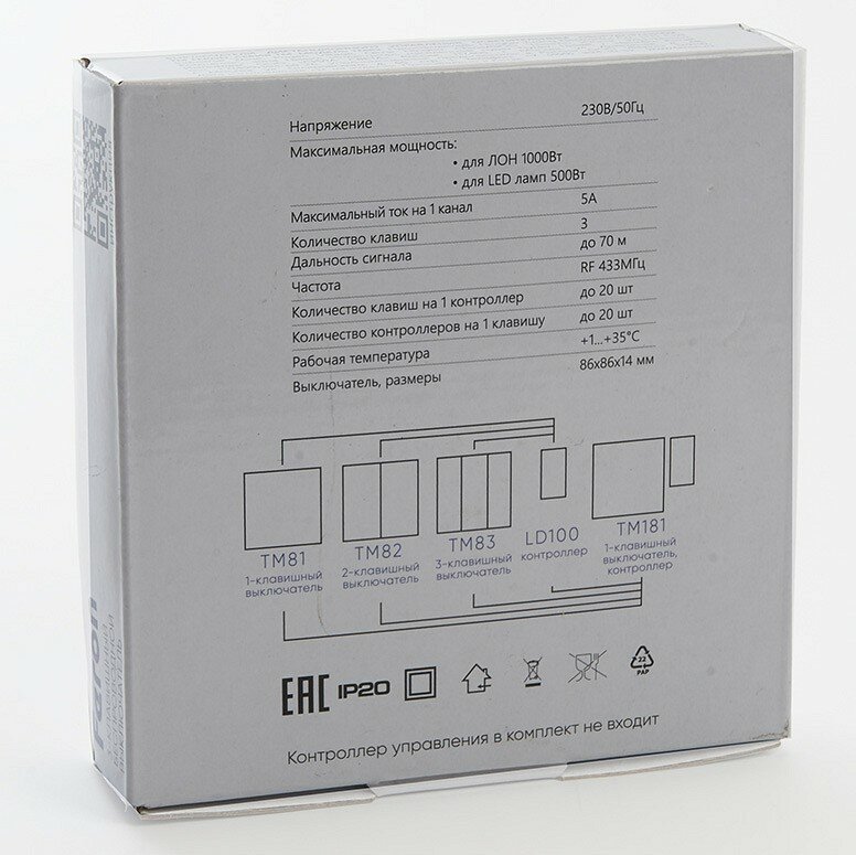 Трехклавишный выключатель дистанционного управления FERON 250V 500W TM83 41130 используется для передачи сигнала блоку управления осветительными приборами. Не требует проводов и батареек и устанавливается любом месте внутри помещения с помощью клейкого крепежа или саморезов. Передает сигнал по радиоканалу 433МГц с прямой видимостью на 70м, с перекрытиями видимости на 25м. Не подходит для использования на улице и в помещениях с повышенным содержанием пыли и влаги.Кнопки-выключатели можно использовать только с контроллерами управления ТМ «FERON» - ТМ181, ТМ281.Дополнительные характеристики:Степень защиты от пыли и влаги - IP20.Тип климатического исполнения - УХЛ4.Рабочая температура - +1.+35°С.Мощность передачи сигнала - 7мВт.Нагрузка - для ЛОН до 1000Вт, для LED до 500Вт.