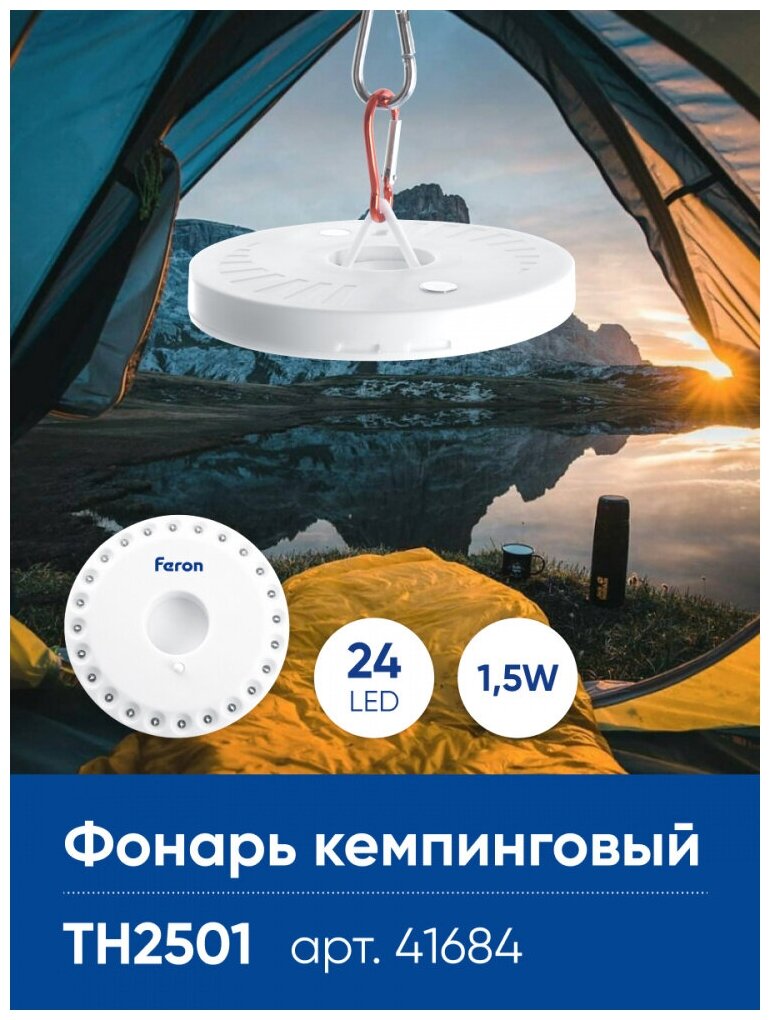 Кемпинговый фонарь светодиодный TH2501 41684 - продукт известной компании Feron (Россия). Имеет максимальную мощность 1.5 Вт. Отлично подойдет для таких мест, как дача, сад, веранда и беседка. Впишется в интерьеры следующих стилей: современный.