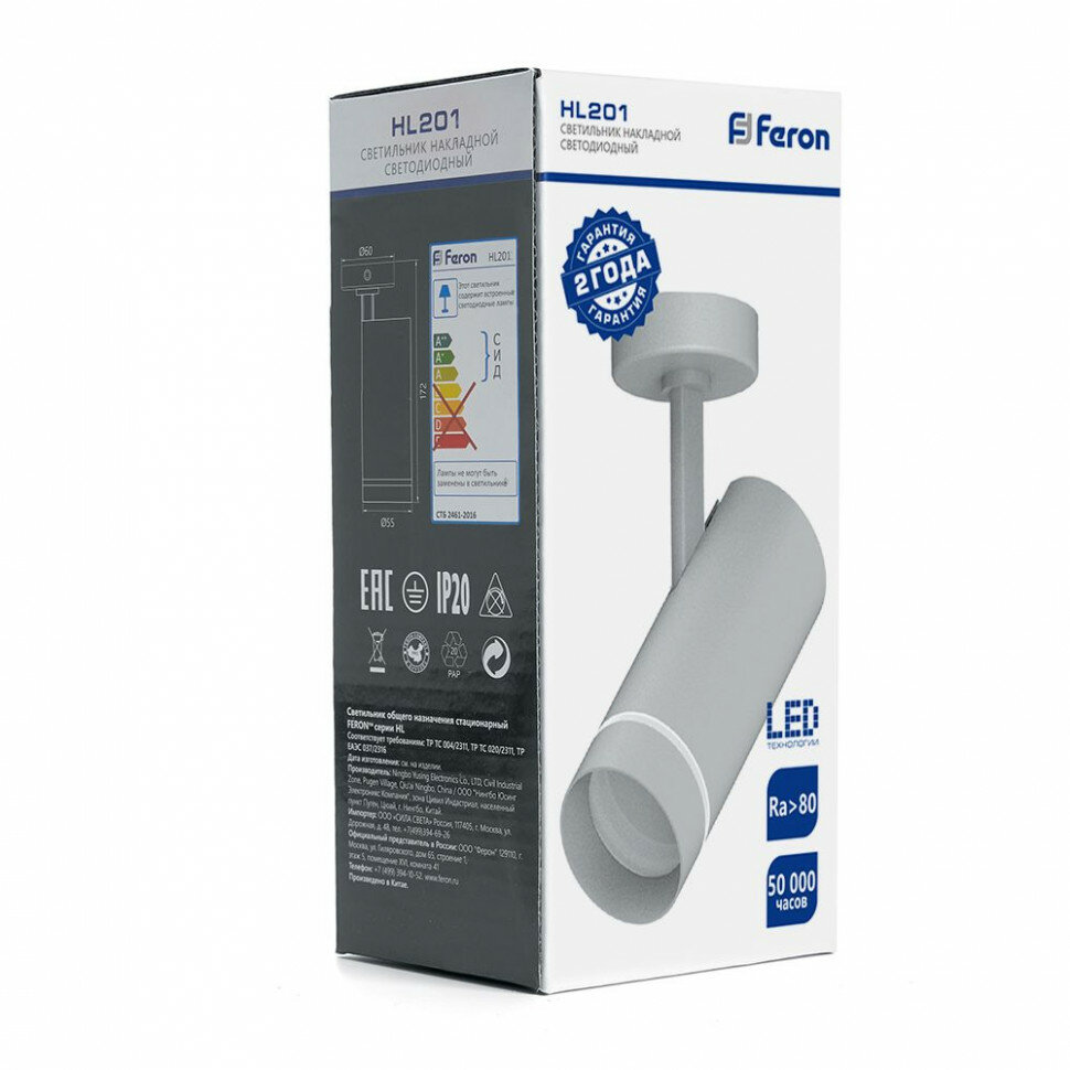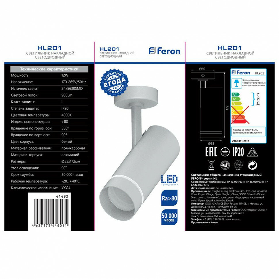 Светильник накладной светодиодный для акцентного освещения, спот поворотный (ДПО) FERON HL201, 12W, 4000К (белый), 170-265V, 900Lm, IP20, угол рассеивания 90°, цвет белый, корпус алюминий, рассеиватель поликарбонат, 55*55*172