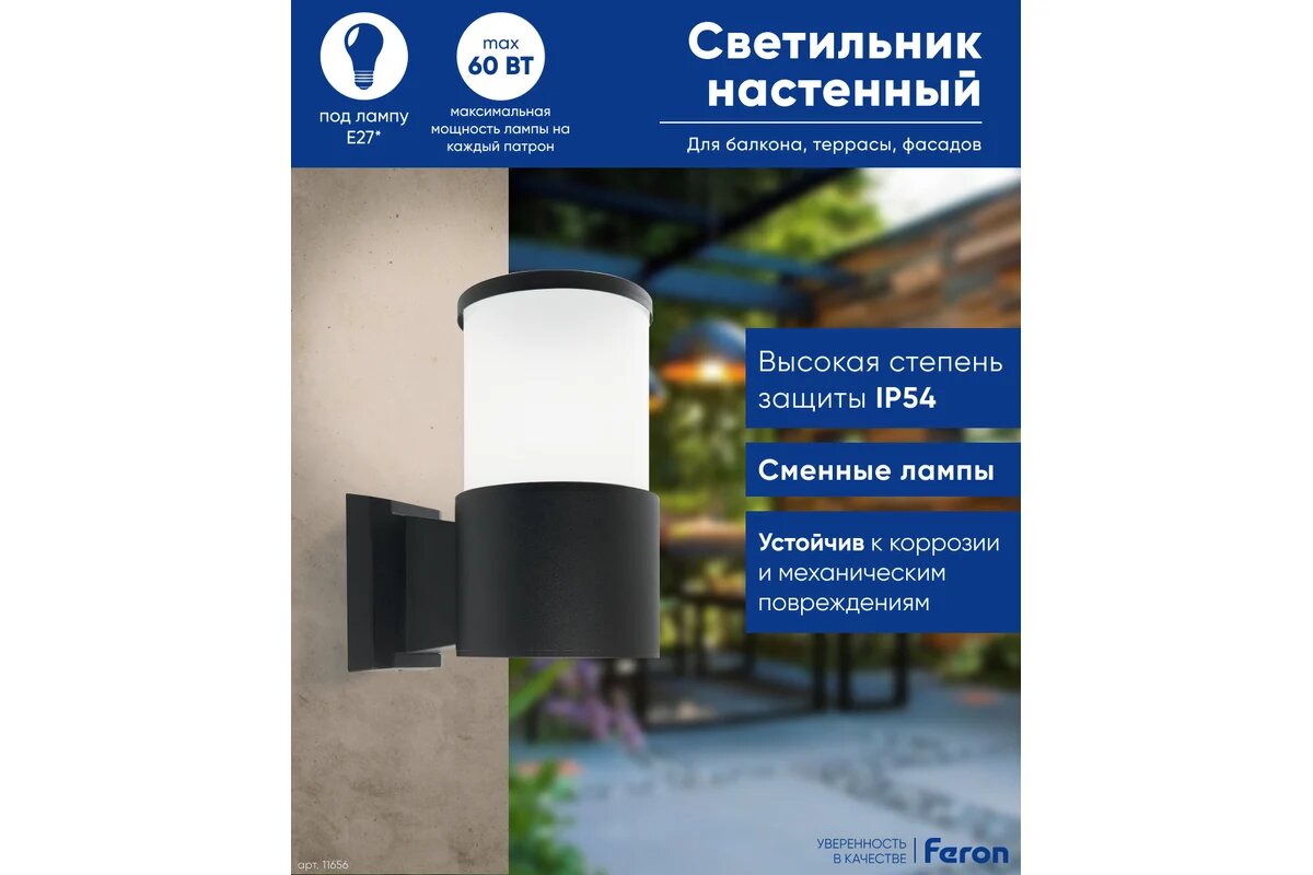 Настенный светильник уличный IP54 - продукт известной компании Feron (Китай). Имеет максимальную мощность 60 Вт, освещает площадь до 3 кв. м. Отлично подойдет для таких мест, как веранда и беседка, фасад. Впишется в интерьеры следующих стилей: модерн.