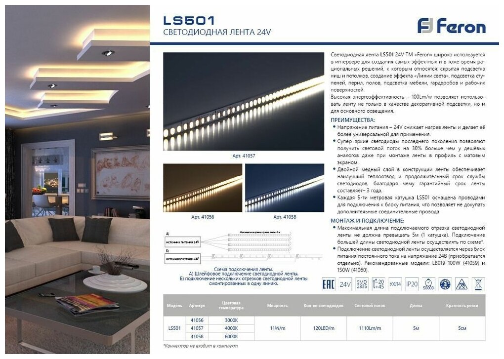 Светодиодная лента 41530 - продукт известной компании Feron (Китай). Имеет максимальную мощность 85 Вт. Отлично подойдет для таких мест, как гостиная, кафе, спальня, кабинет, офис, магазин. Впишется в интерьеры следующих стилей: современный.